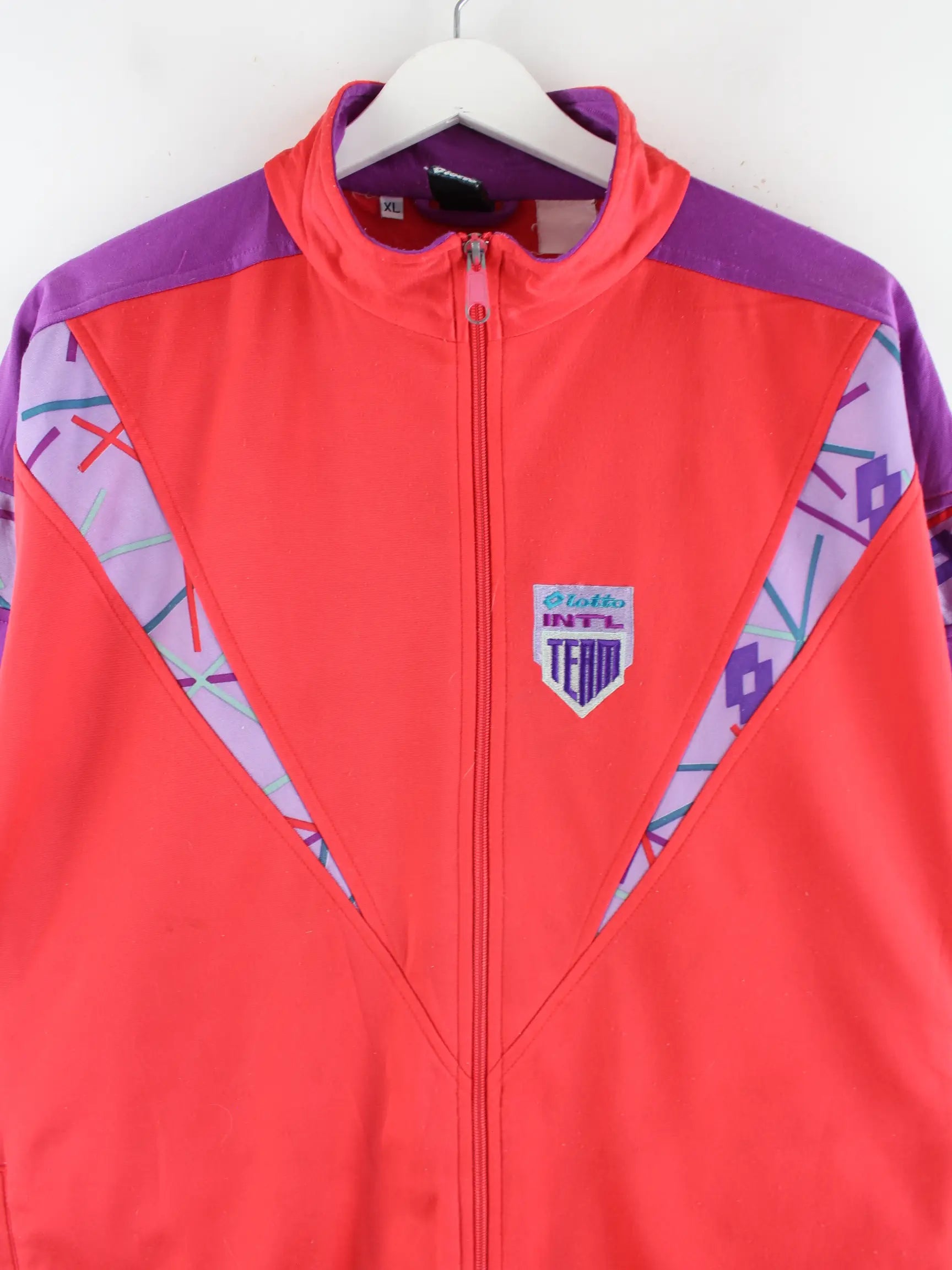 Trainingsjacke vom Label Lotto in Größe XL aus den 90'ern. Sie ist aus Synthetik gefertigt und in Rot vorrätig.