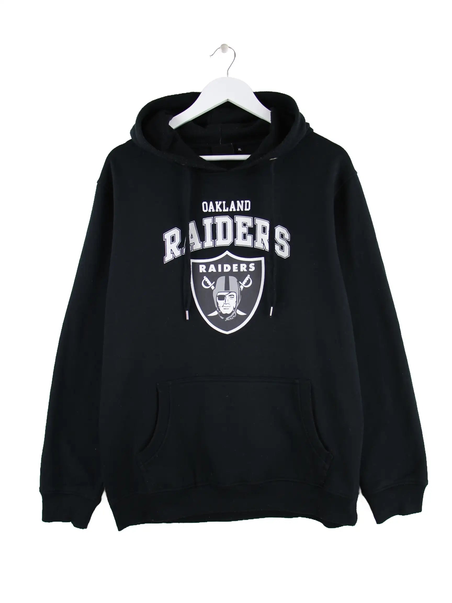 Hoodie vom Brand NFL in Größe XL. Er ist aus einer Baumwollmischung und in Schwarz in Stock. Mit chiquem Raiders Print.