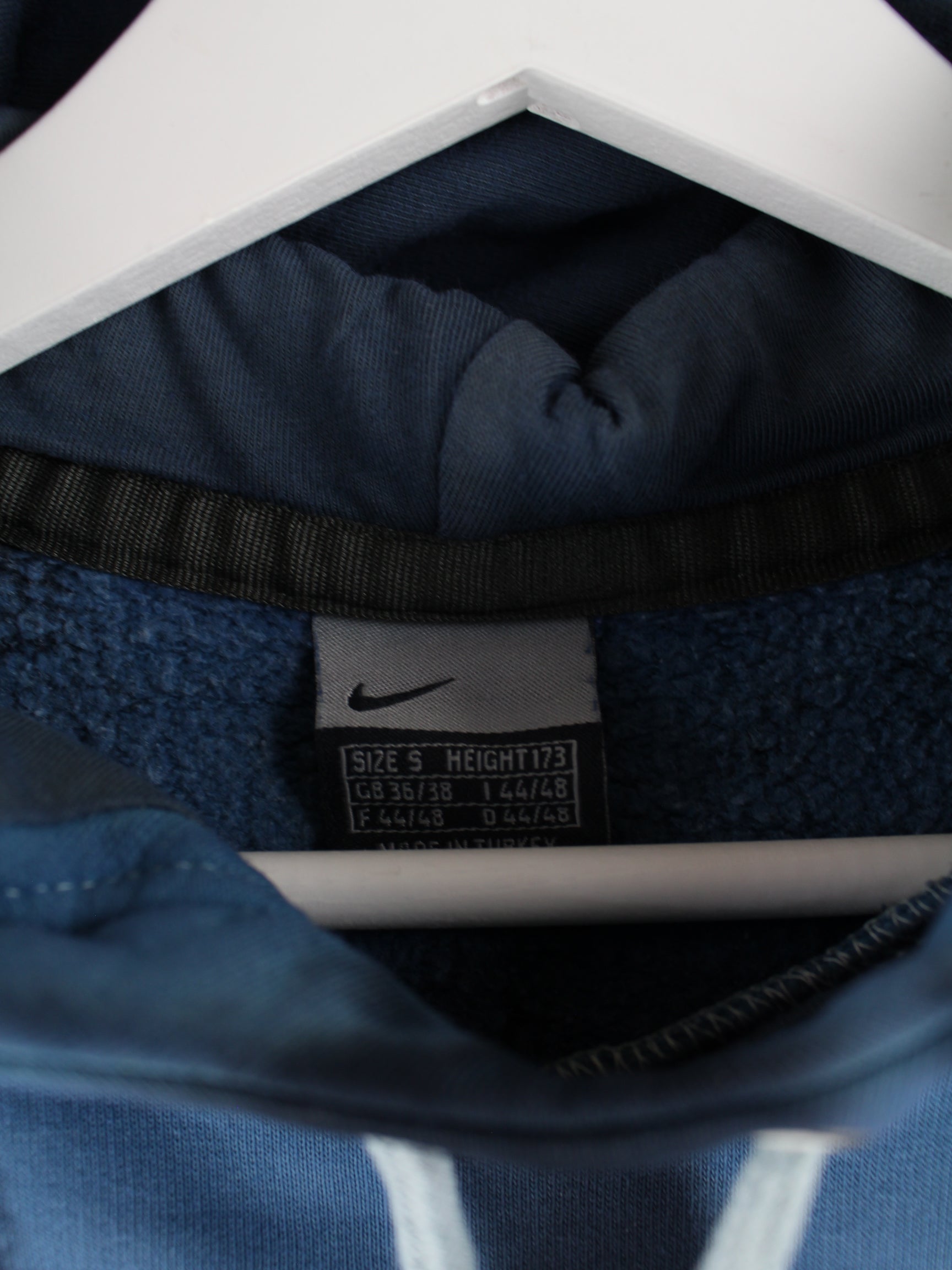 Hoodie from the Nike label with embroidery in size S. It is made from a cotton blend and is available from us in blue.