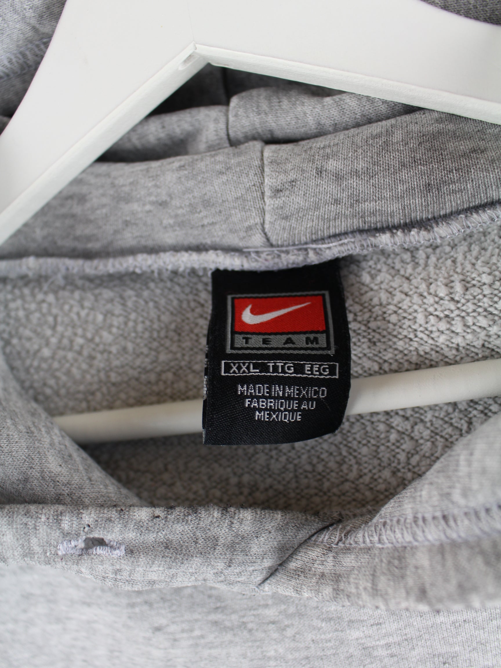 Hoodie der Marke Nike mit Stickereien in Größe XXL. Er ist aus einer Baumwollmischung hergestellt und in Grau im Bestand.