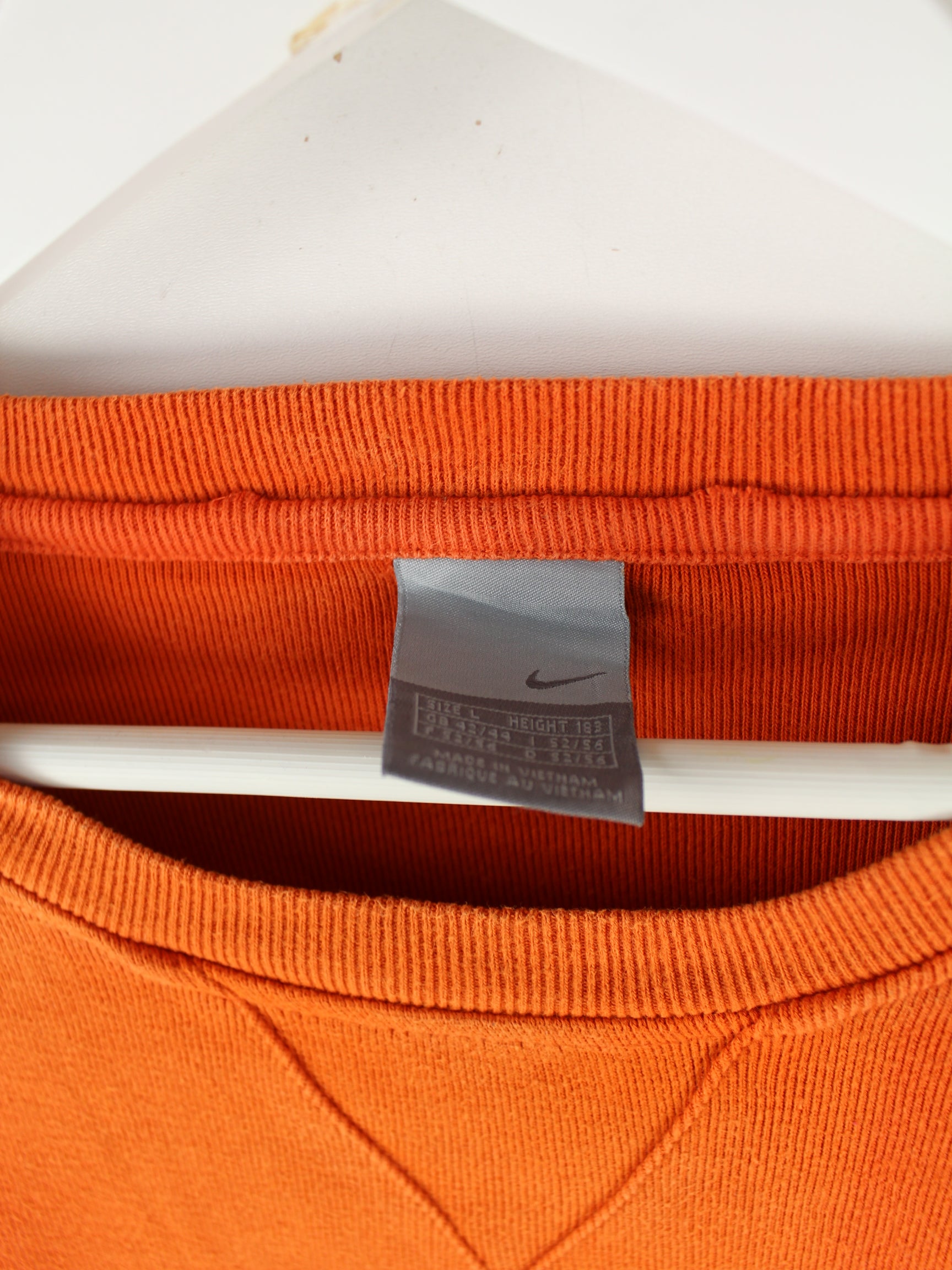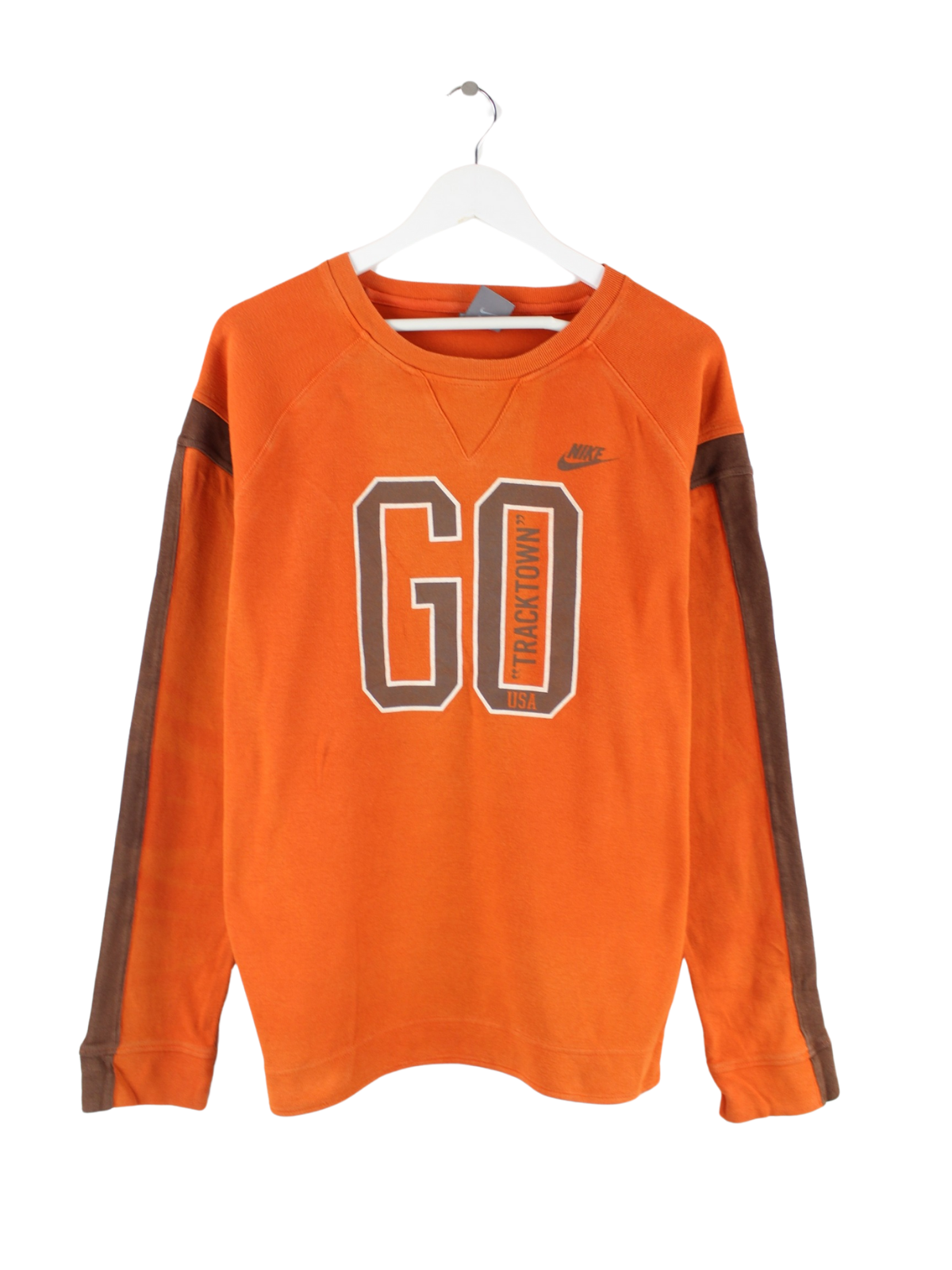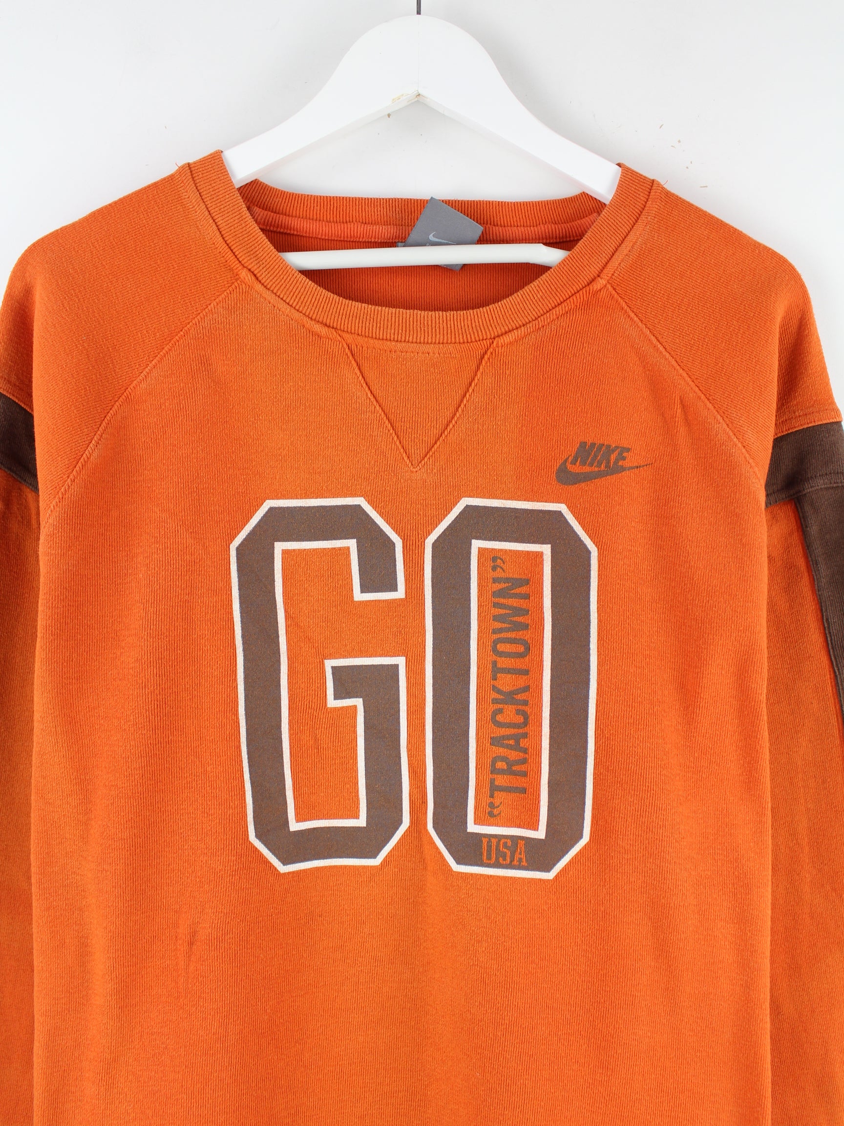 Sweater der Marke Nike in Größe L. Er ist aus einer Baumwollmischung gemacht und in Orange auf Lager. Mit schickem Tracktown Print.