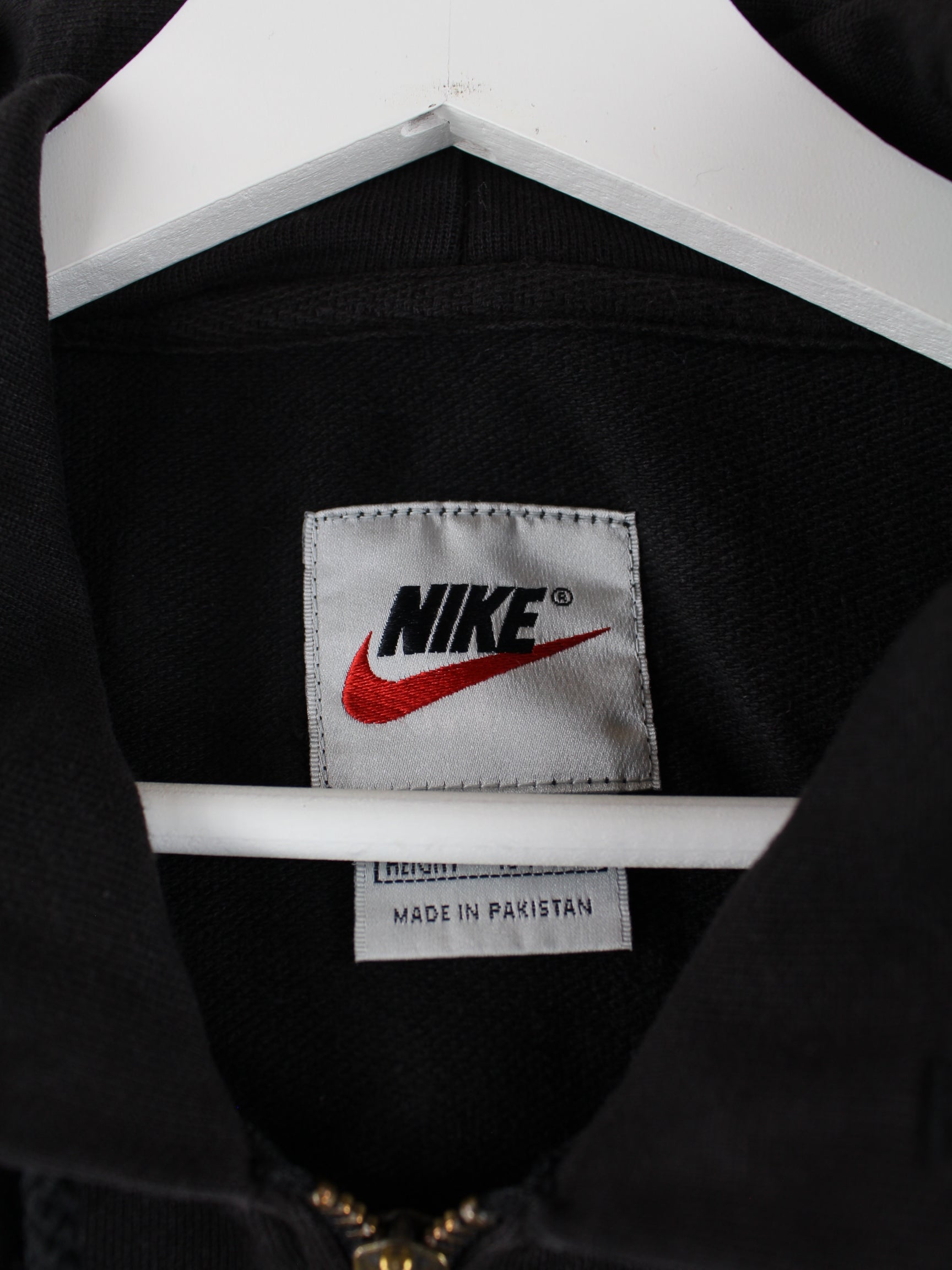 Schwarzer Hoodie mit Reißverschluß aus dem Hause Nike aus den 90'ern in Größe M. Er ist aus einer Baumwollmischung angefertigt und in gutem Zustand zu bekommen.
