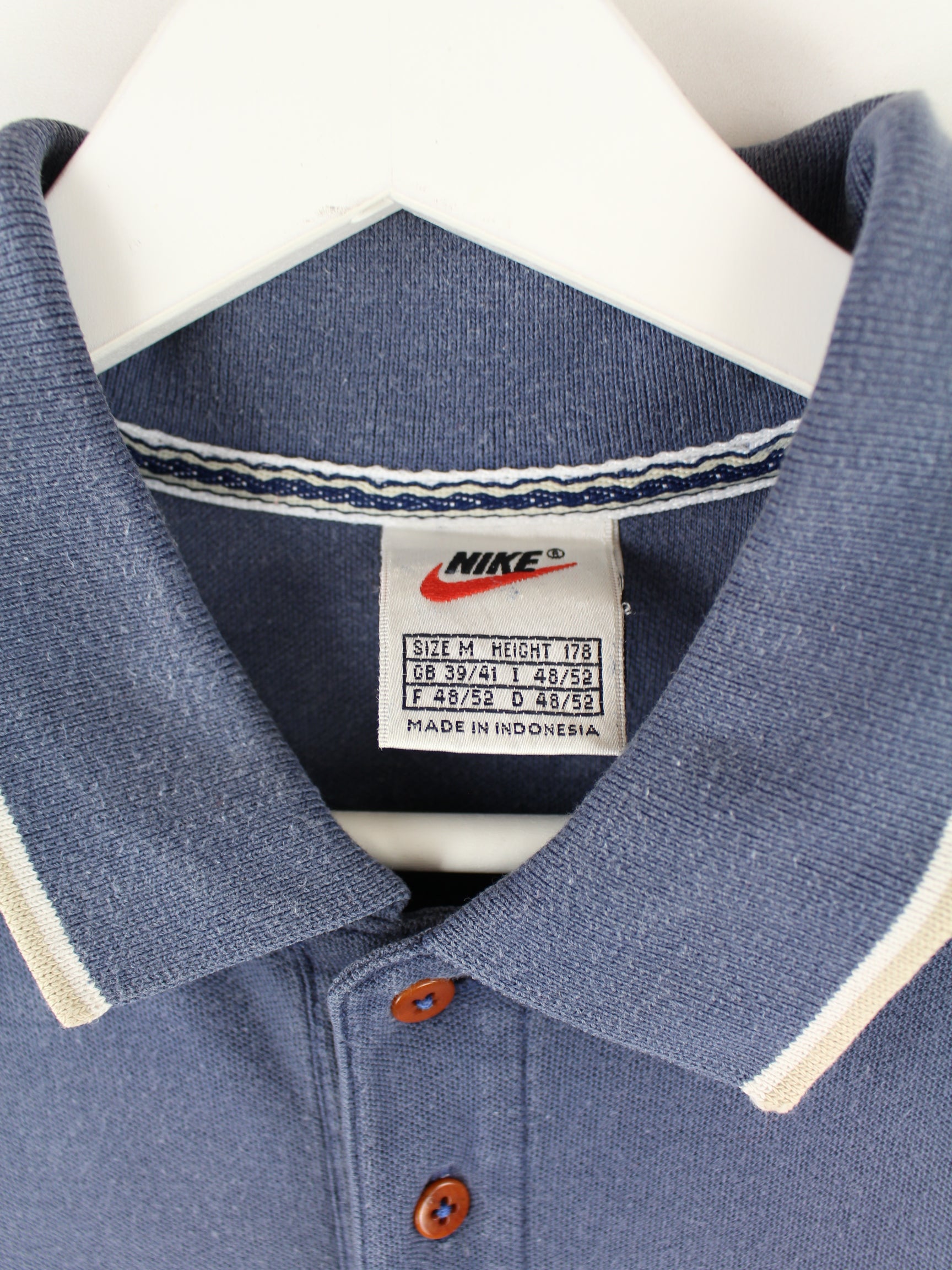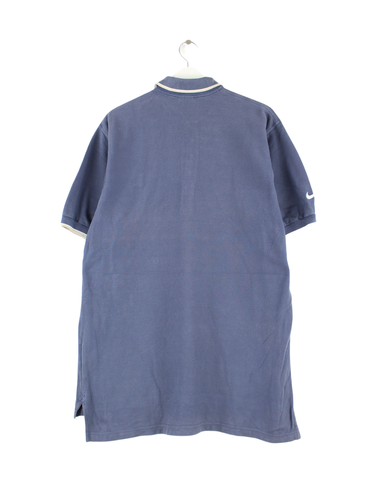 Polo shirt from Nike with embroidered motifs in size L from the 90's. It is made of cotton and is available from us in blue.