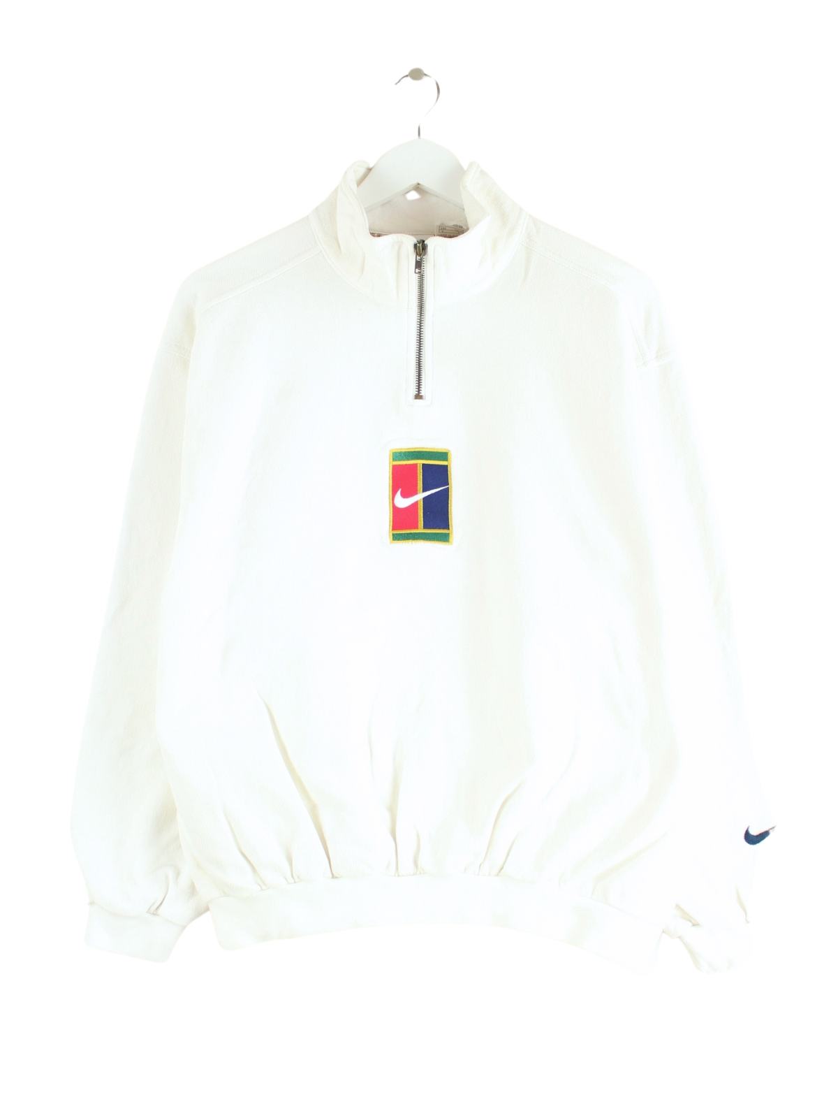 White sweater with Nike embroidery from the 90's in size S. It is made from a cotton blend. We would describe the condition as 'fine' (see pictures).