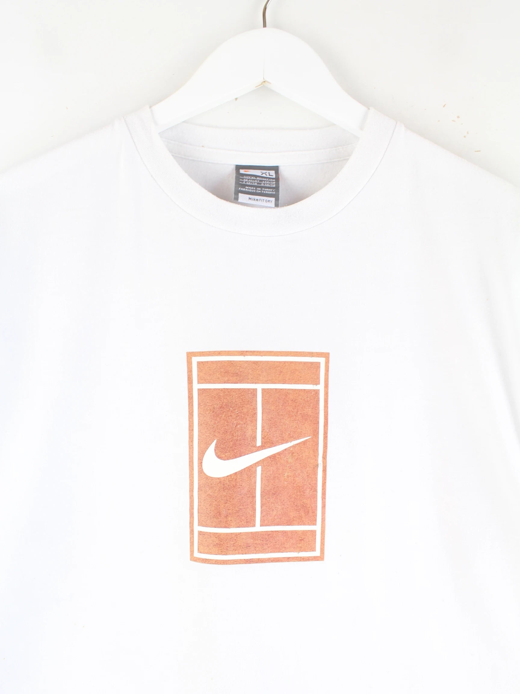 Weißes T-Shirt der Brand Nike in Größe XL. Es ist aus Baumwolle hergestellt. Den Zustand würden wir als 'In Ordnung' bezeichnen (vergl. Bilder).Mit chiquem Court Print.