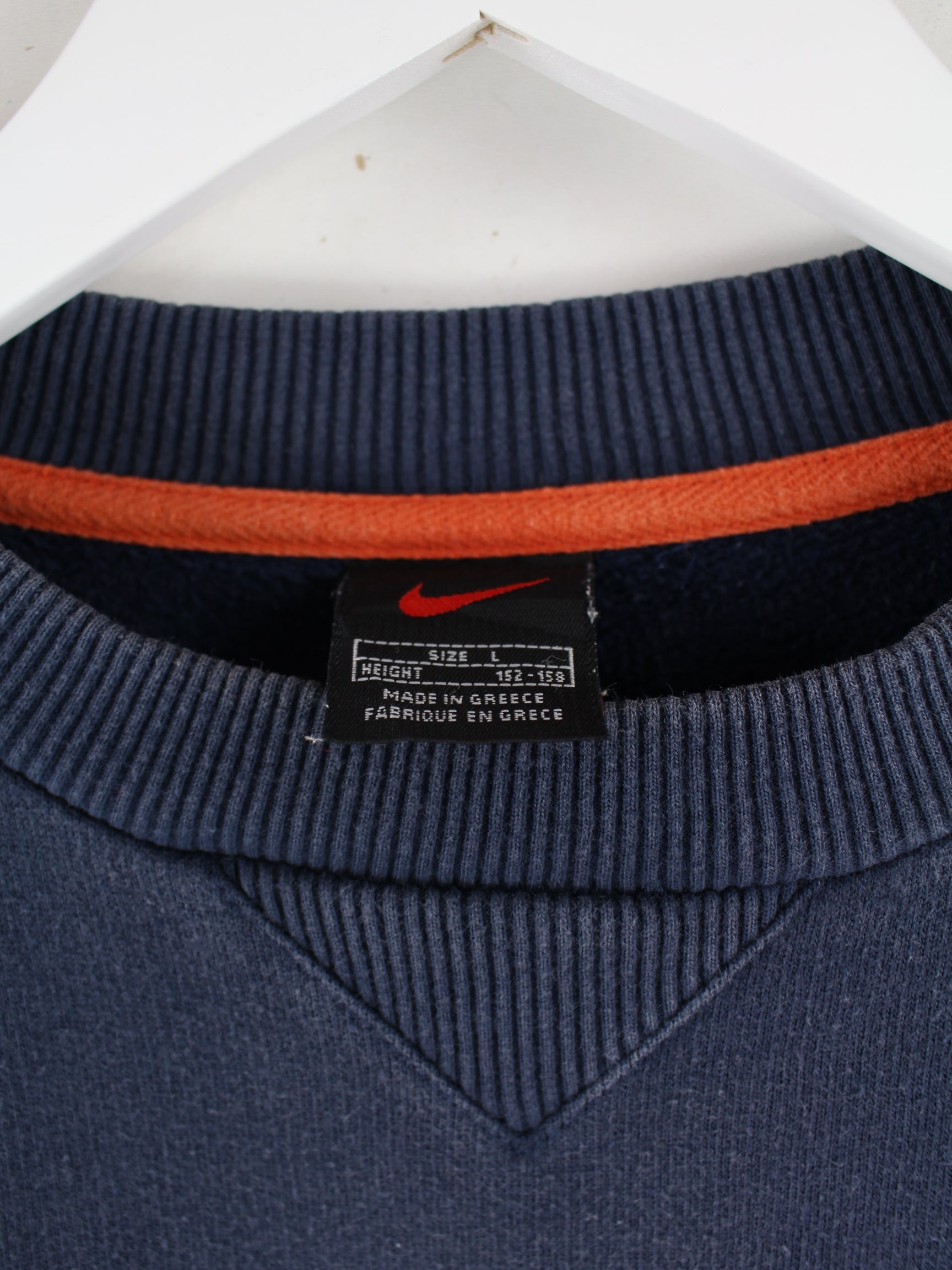 Nike brand sweater with embroidered logo in size XS from the 90's. It is made from a cotton blend and is available in blue.