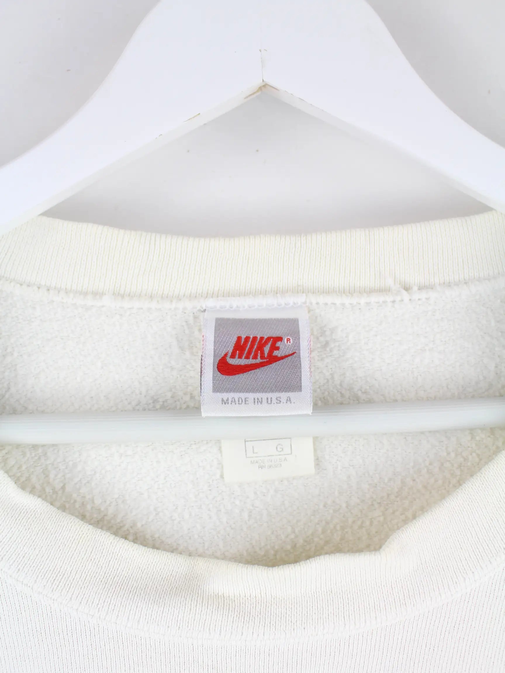 Sweater der Brand Nike in Größe XXL aus den 80'ern. Er ist aus einer Baumwollmischung und in Weiß zu haben. Mit chiquem Tag Print.