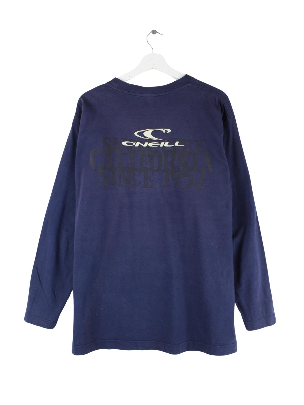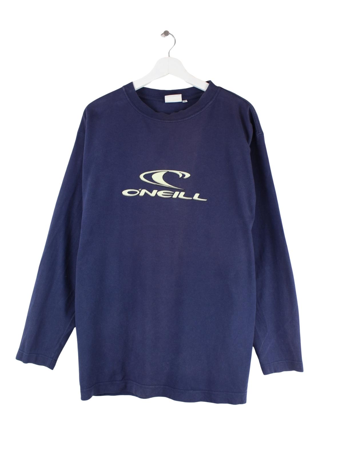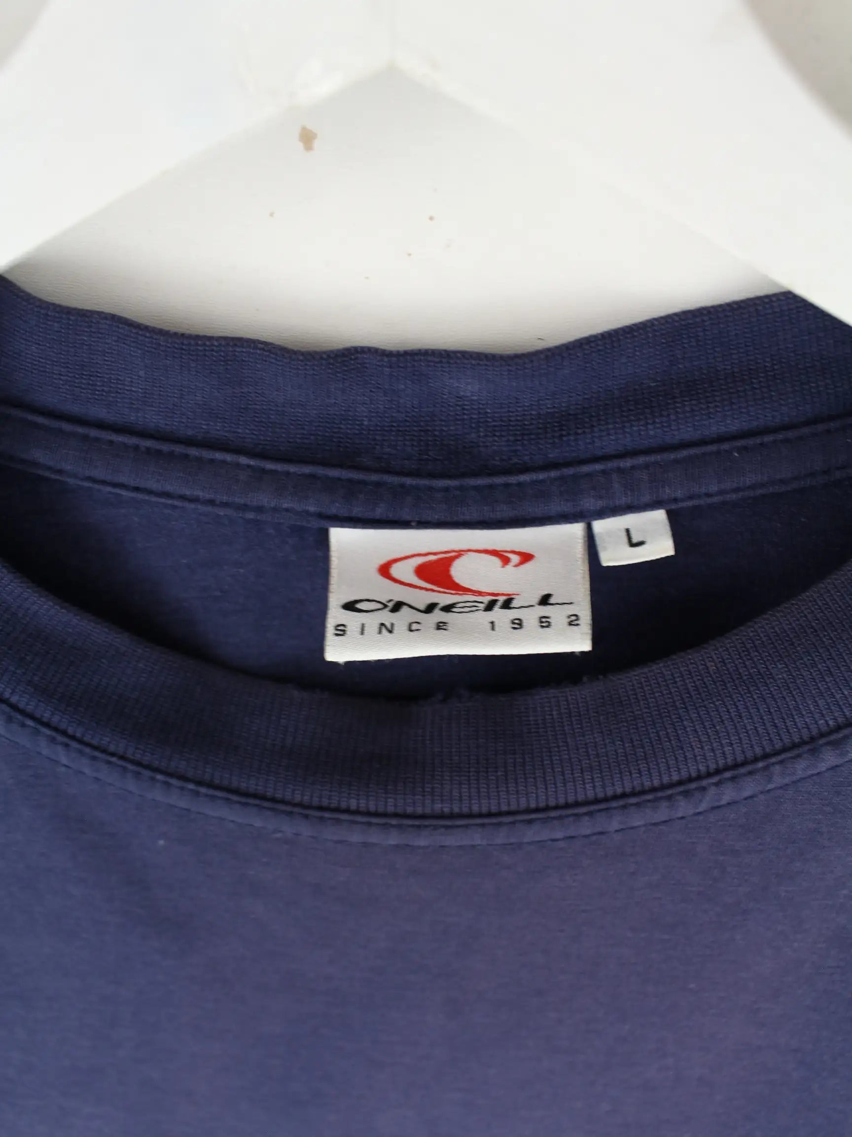 Sweatshirt vom Label O'Neill in Größe L aus den 90'ern. Es ist aus Baumwolle hergestellt und in Blau lieferbar. Mit seltenem Vintage Print.