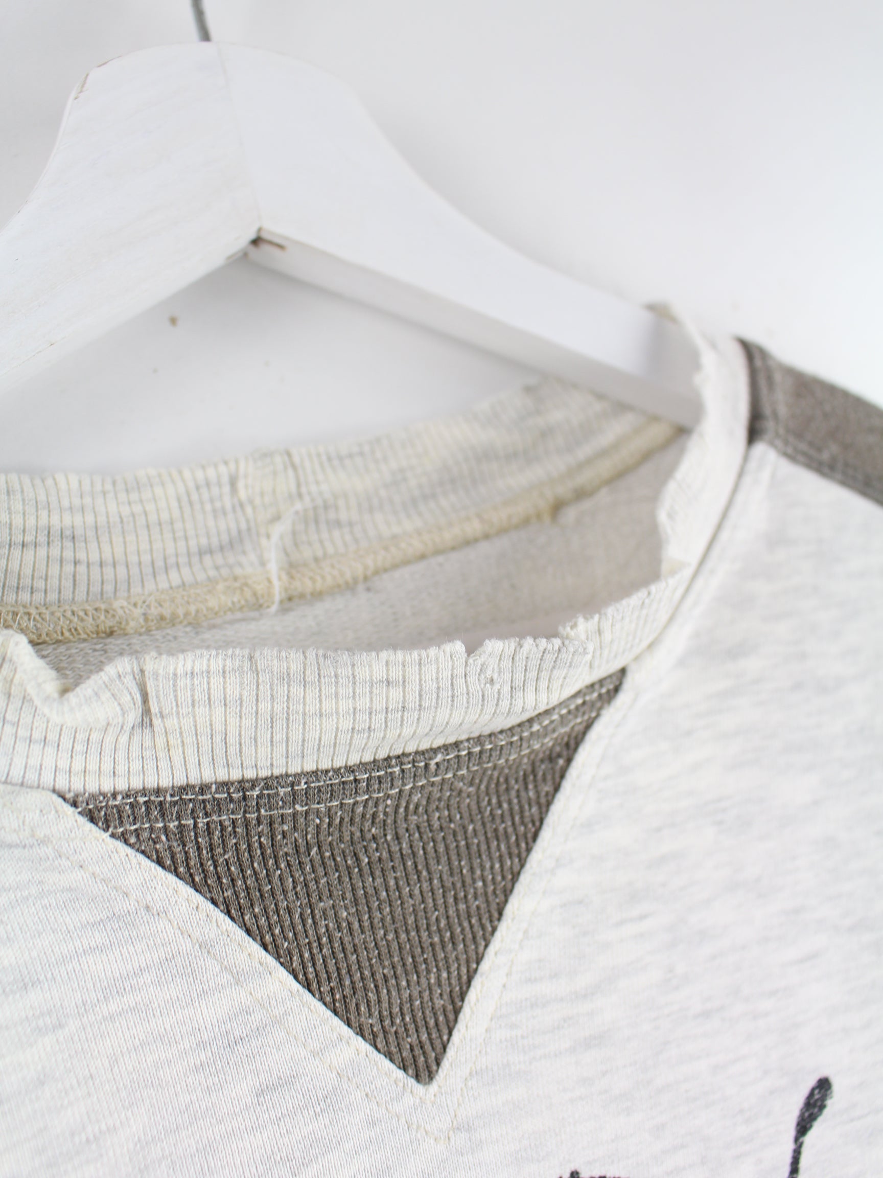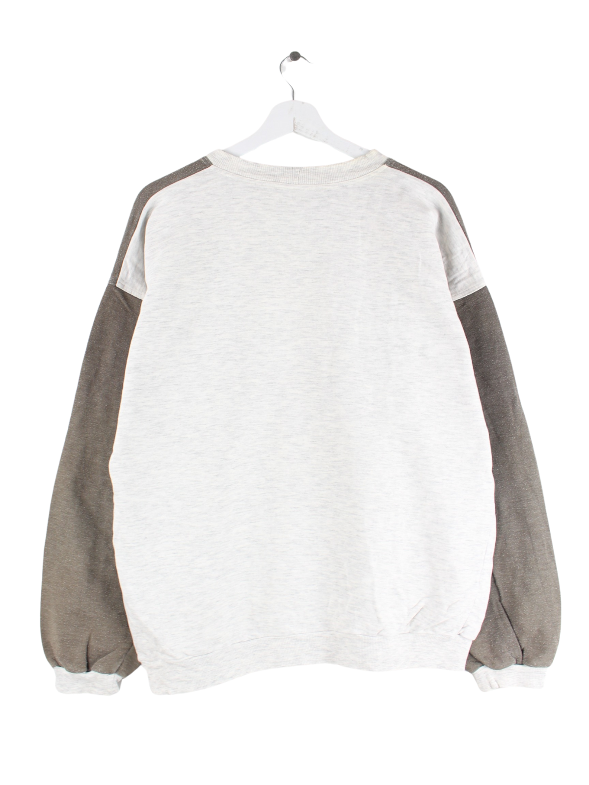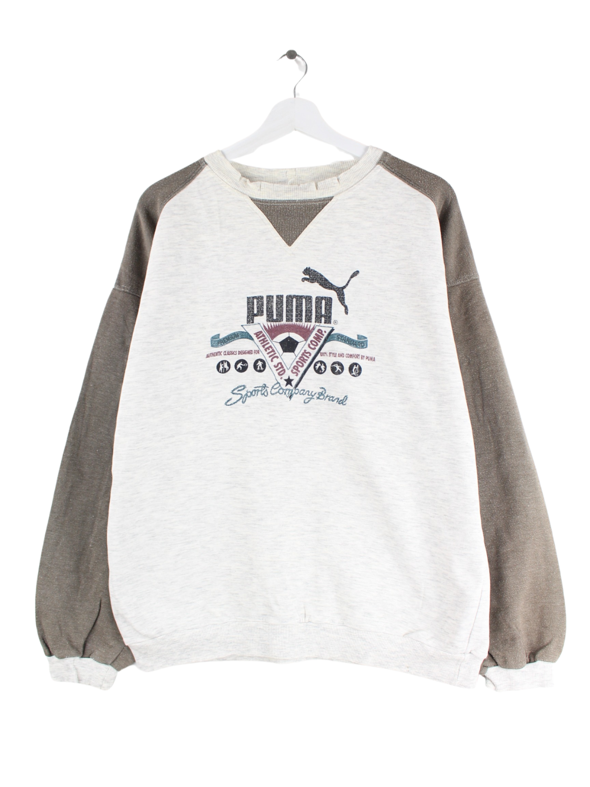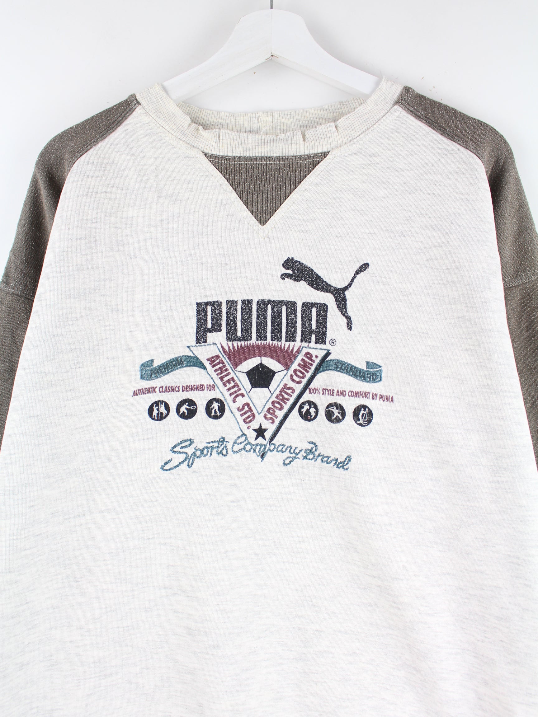 Grauer Sweater des Labels Puma aus den 80'ern in Größe M. Er ist aus einer Baumwollmischung gefertigt und in gutem Zustand auf Lager. Mit tollem Vintage Print.