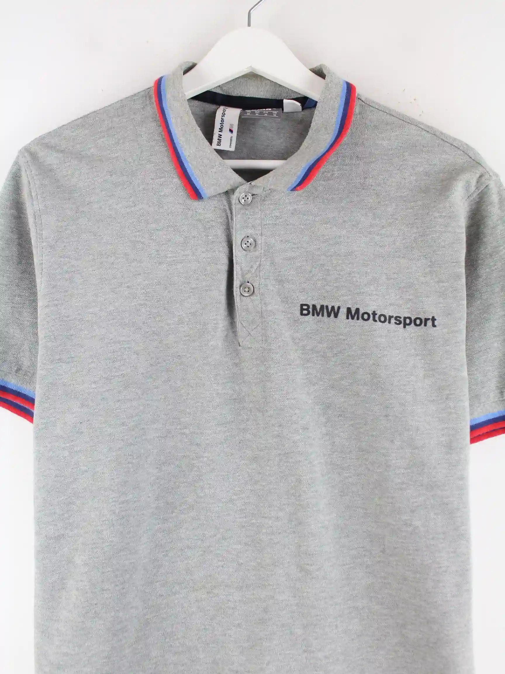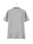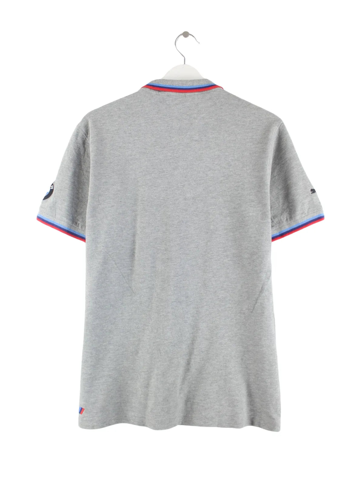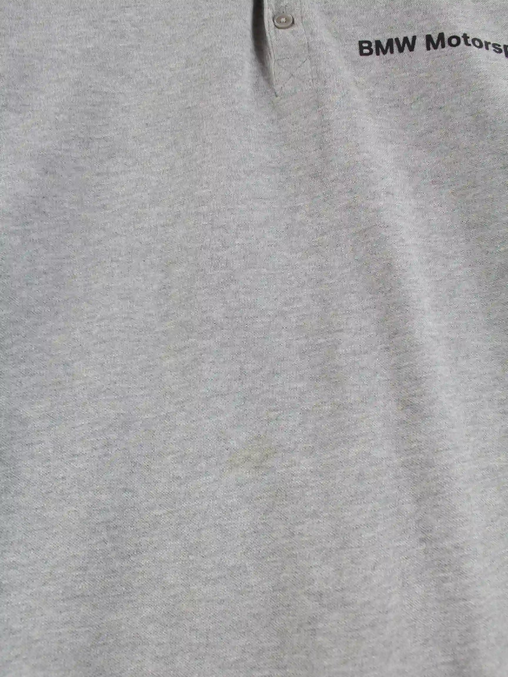 Graues Poloshirt der Brand Puma in Größe M. Es ist aus Baumwolle gemacht und in gutem Zustand bei uns zu bekommen. Mit schickem BMW Print.
