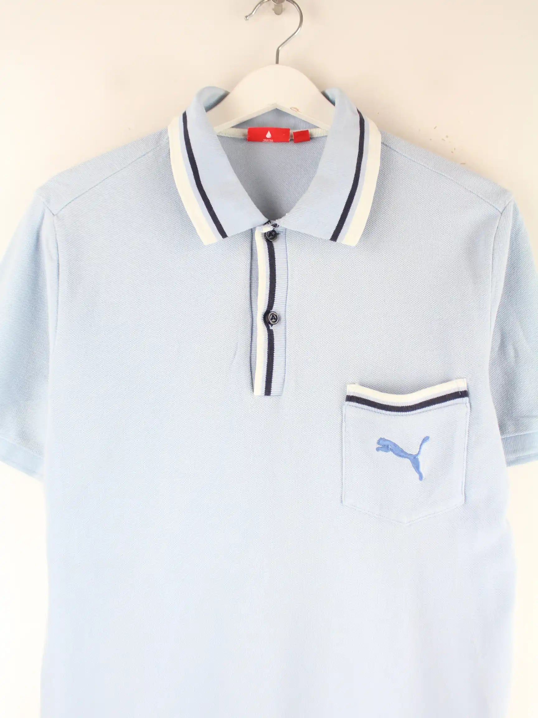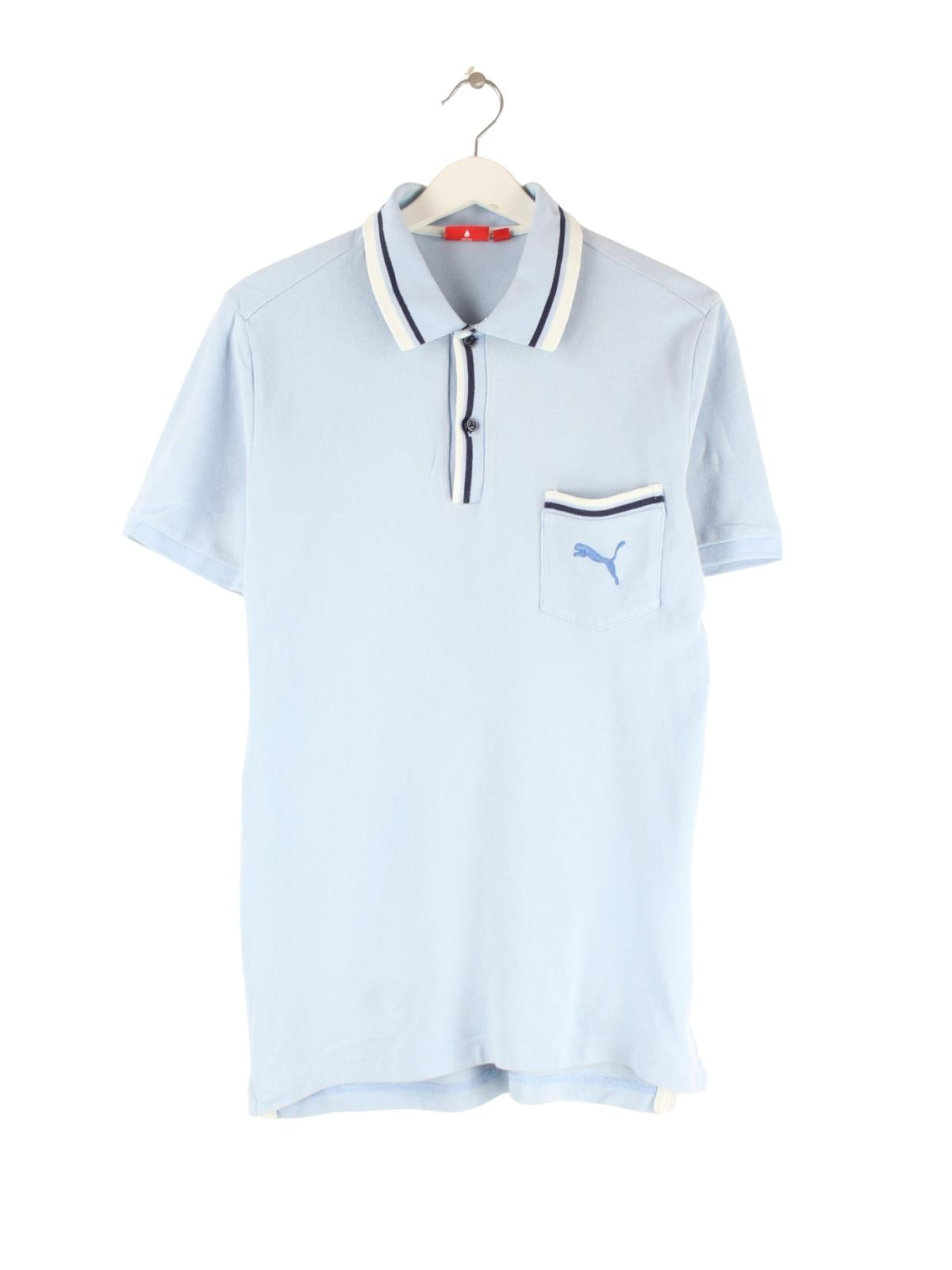 Blaues Poloshirt der Brand Puma in Größe M. Es ist aus Baumwolle hergestellt und in sehr gutem Zustand im Bestand.