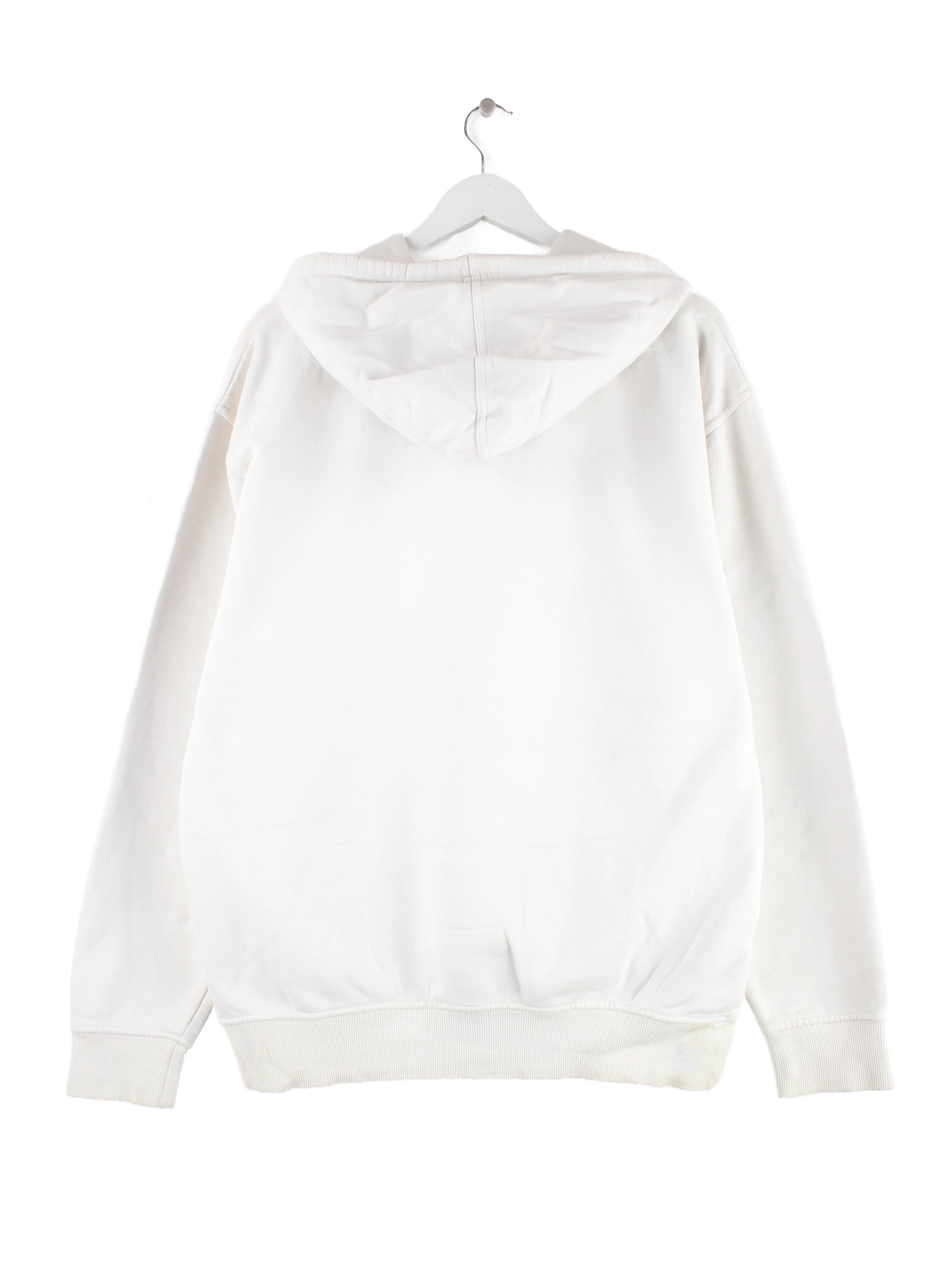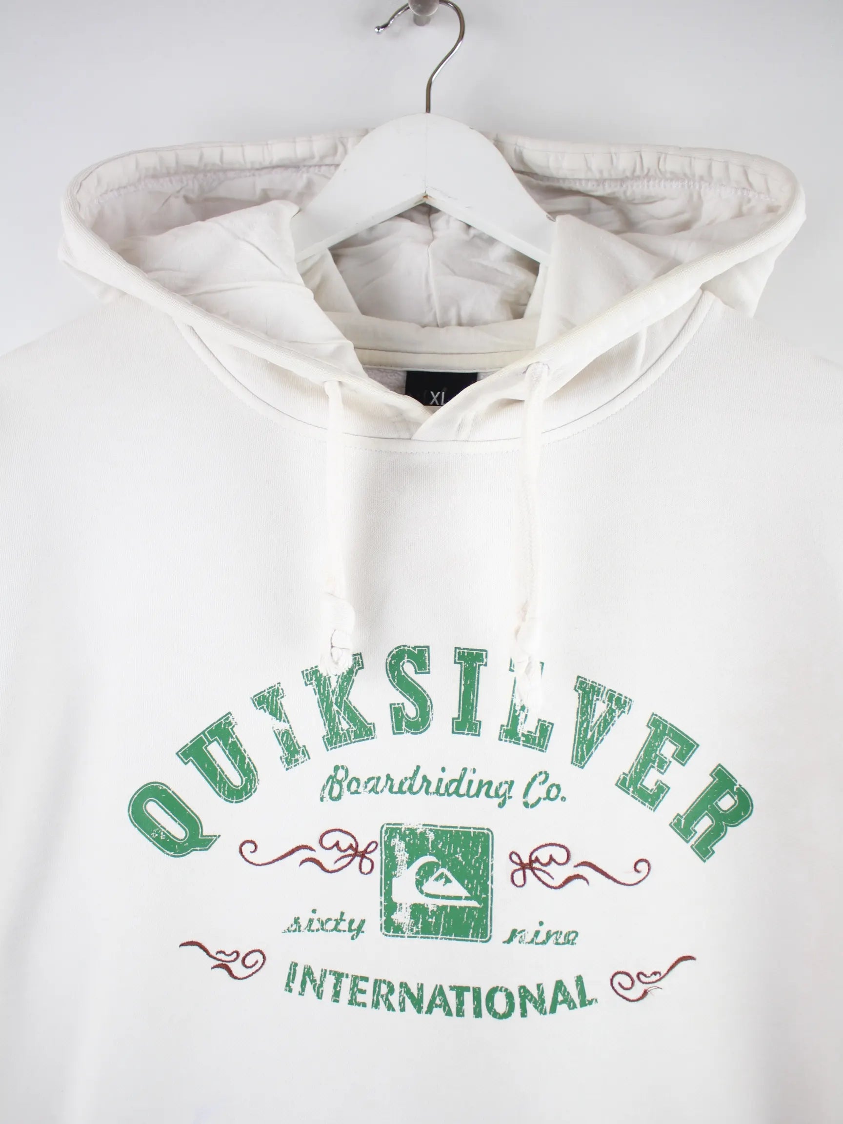 Weißer Hoodie aus dem Hause Quiksilver in Größe XL. Er ist aus einer Baumwollmischung produziert und in gutem Zustand im Bestand. Mit schickem 00s Print.