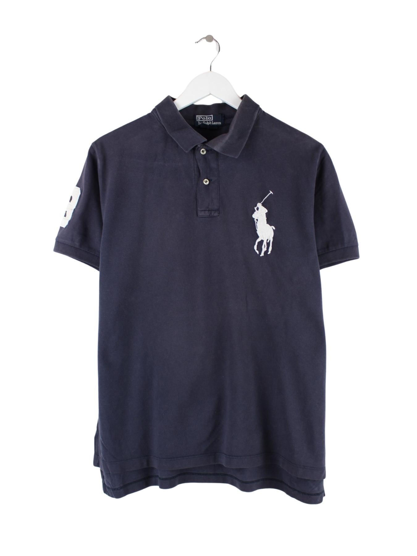 Blaues Poloshirt mit gestickten Motiven des Labels Ralph Lauren aus den 90'ern in Größe M. Es ist aus Baumwolle angefertigt und in gutem Zustand in Stock.