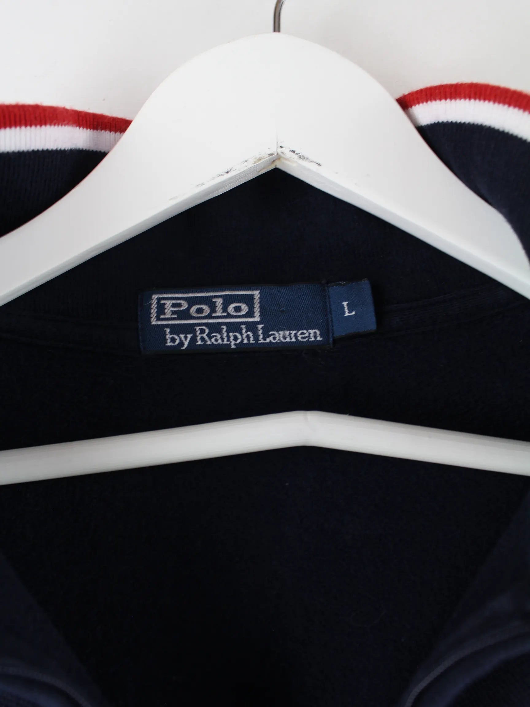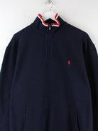 Blauer Sweater mit half Zip vom Label Ralph Lauren aus den 90'ern in Größe L. Er ist aus einer Baumwollmischung angefertigt und in sehr gutem Zustand bei uns vorrätig.