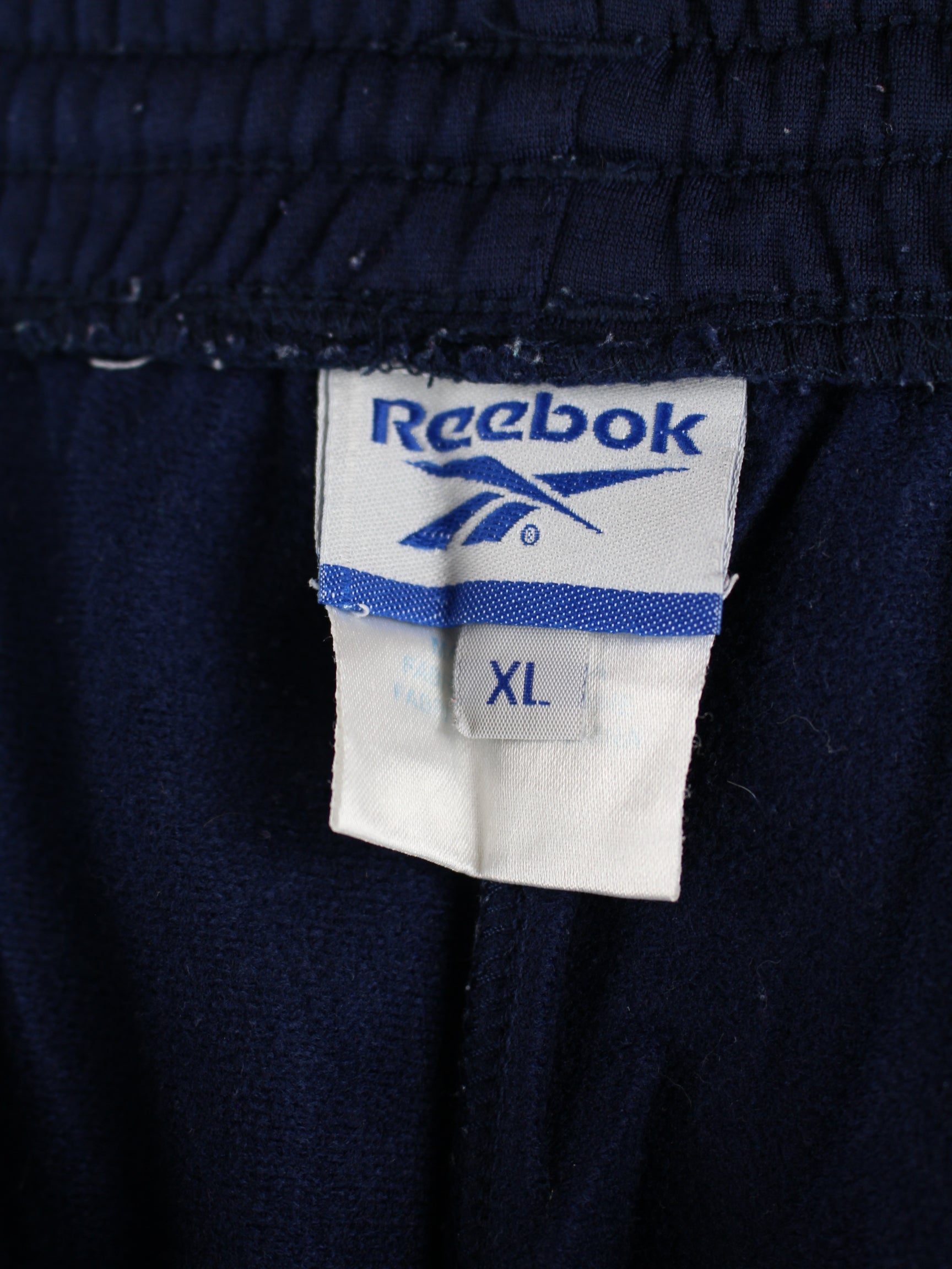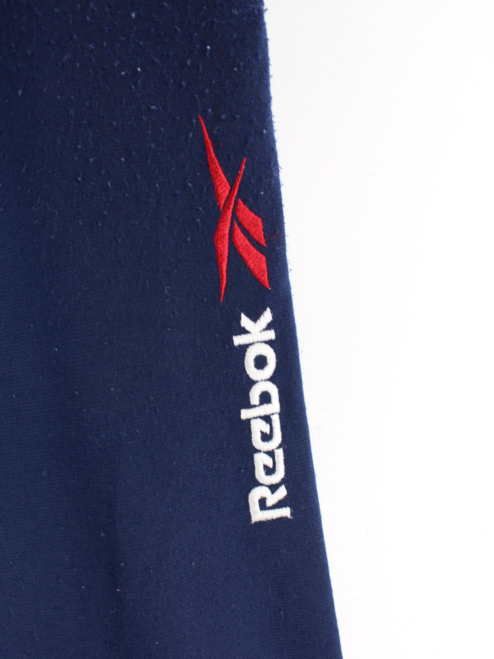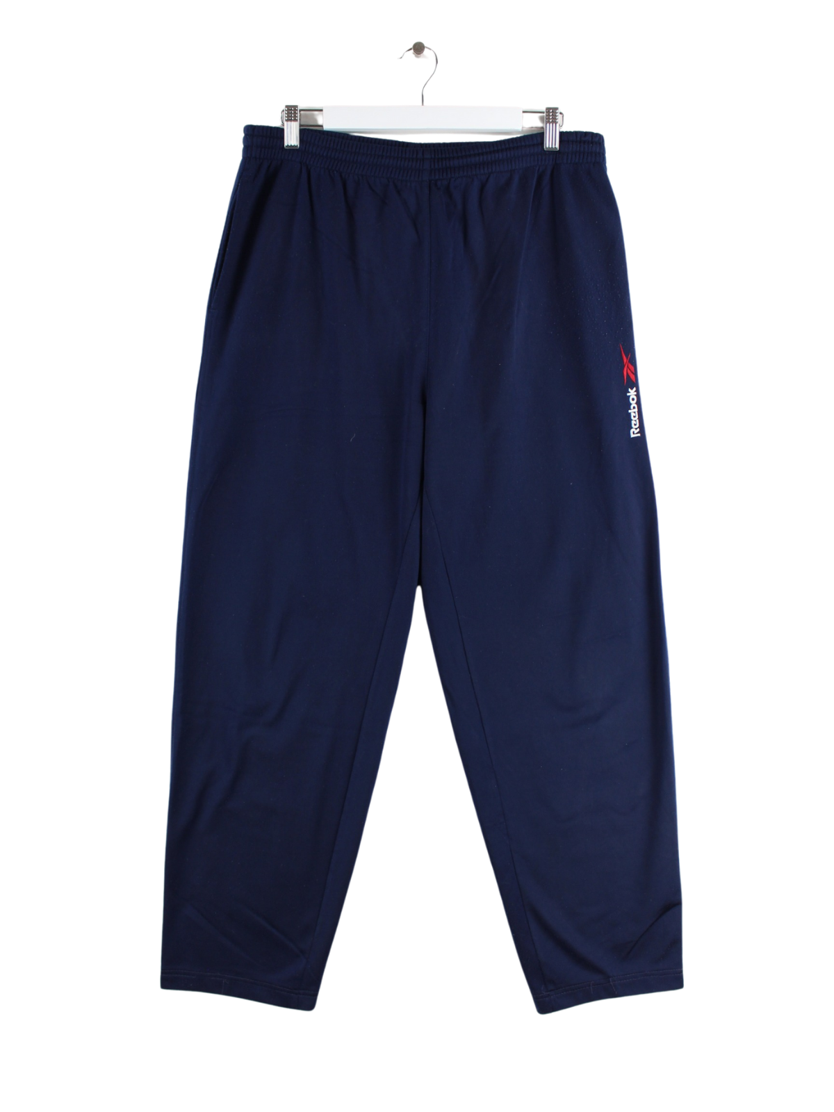 Blaue Track Pants mit gestickten Motiven von Reebok in Größe XL. Sie sind aus Synthetik gefertigt und in gutem Zustand im Bestand.