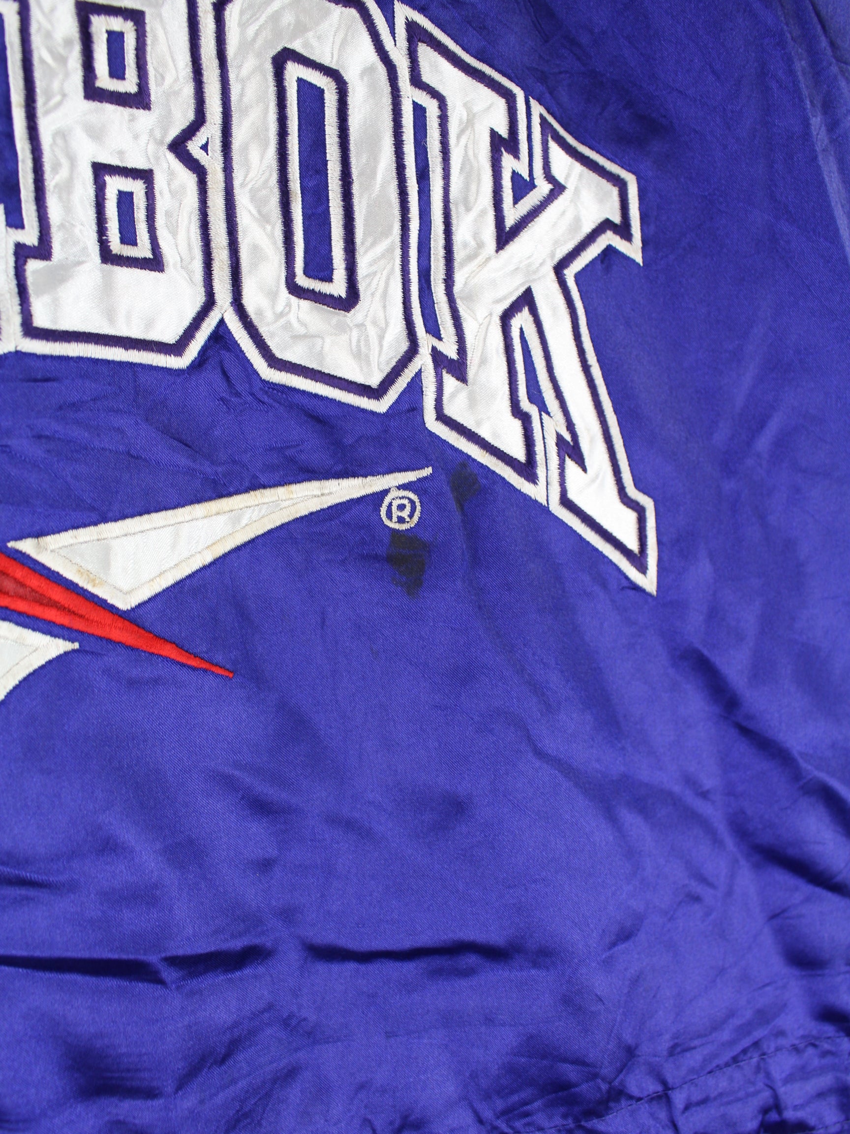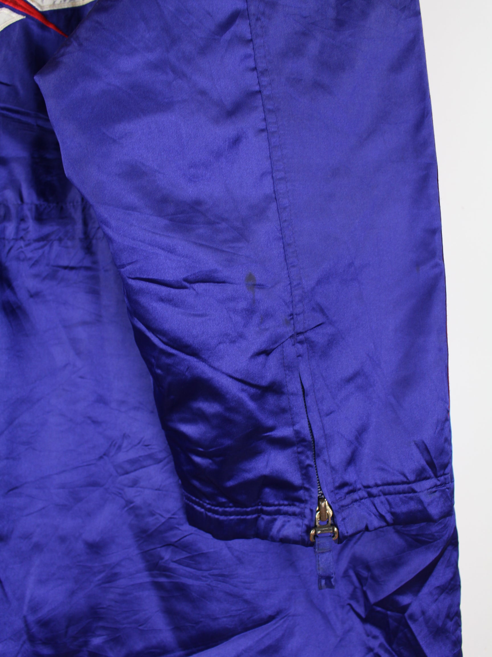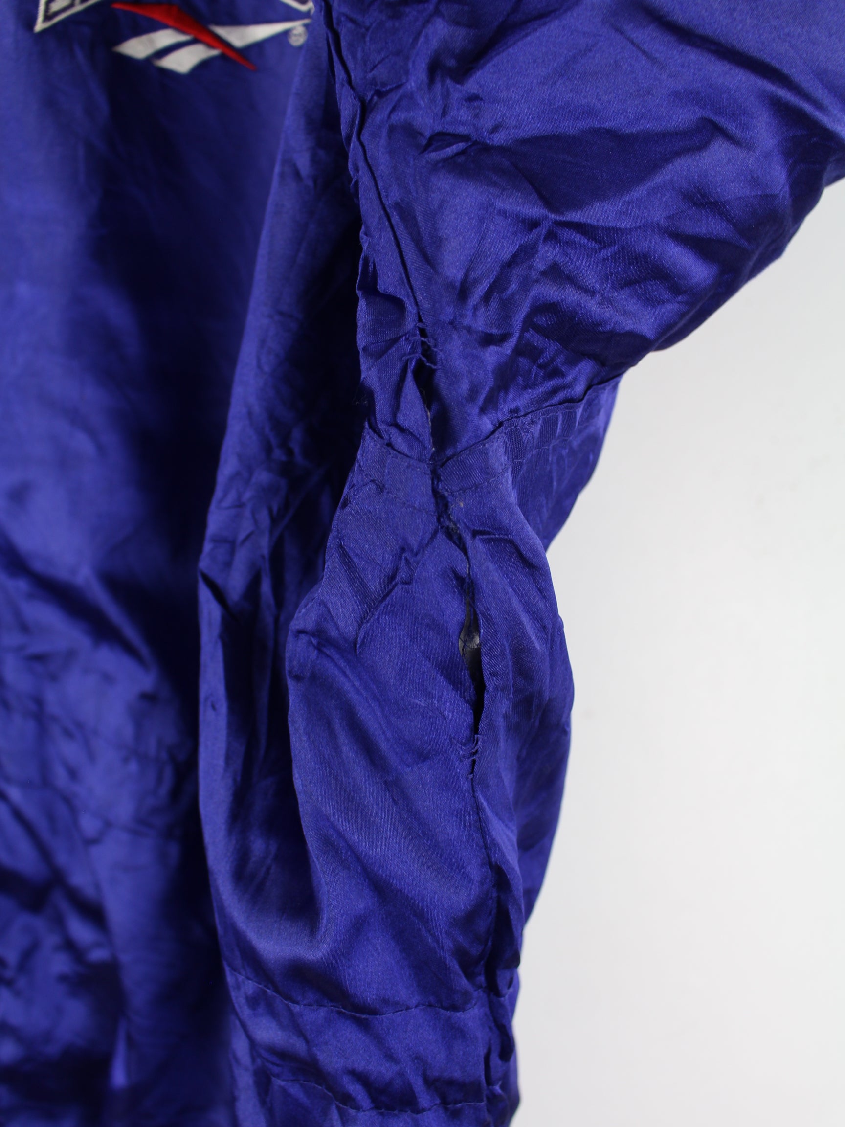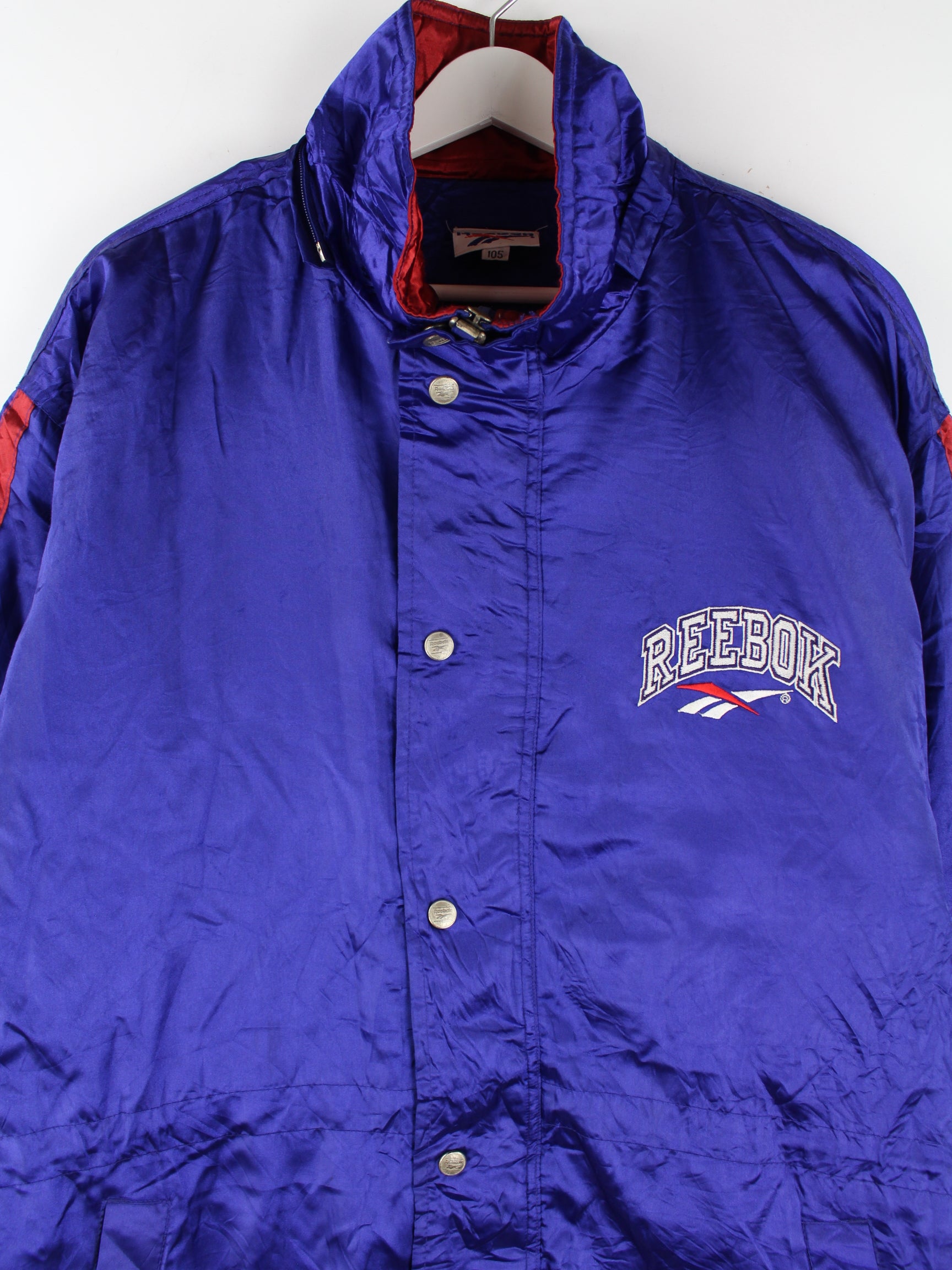 Jacke vom Label Reebok mit Stickereien in Größe XL aus den 90'ern. Sie ist aus Synthetik gemacht und in Blau bei uns zu bekommen.