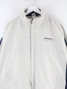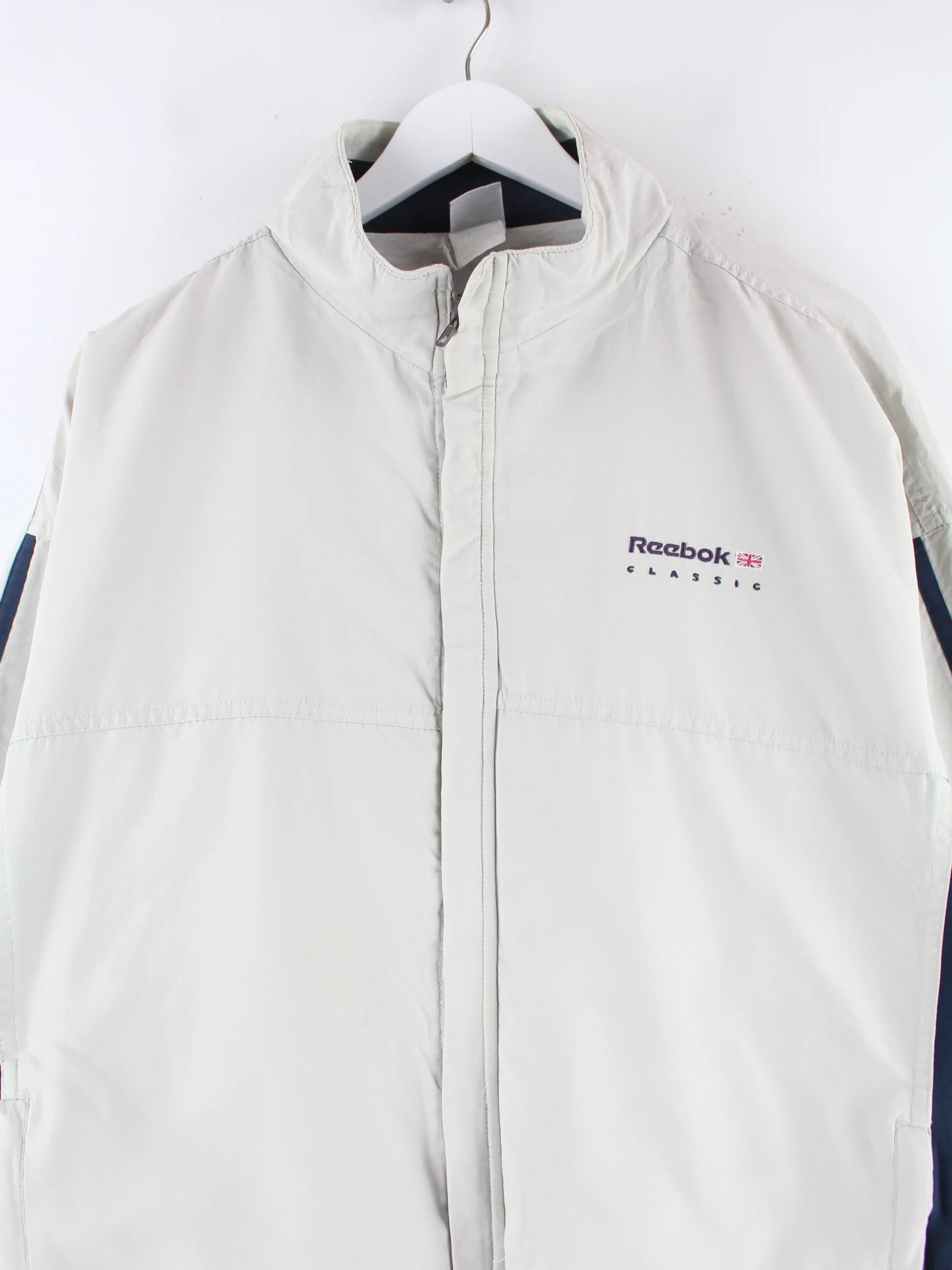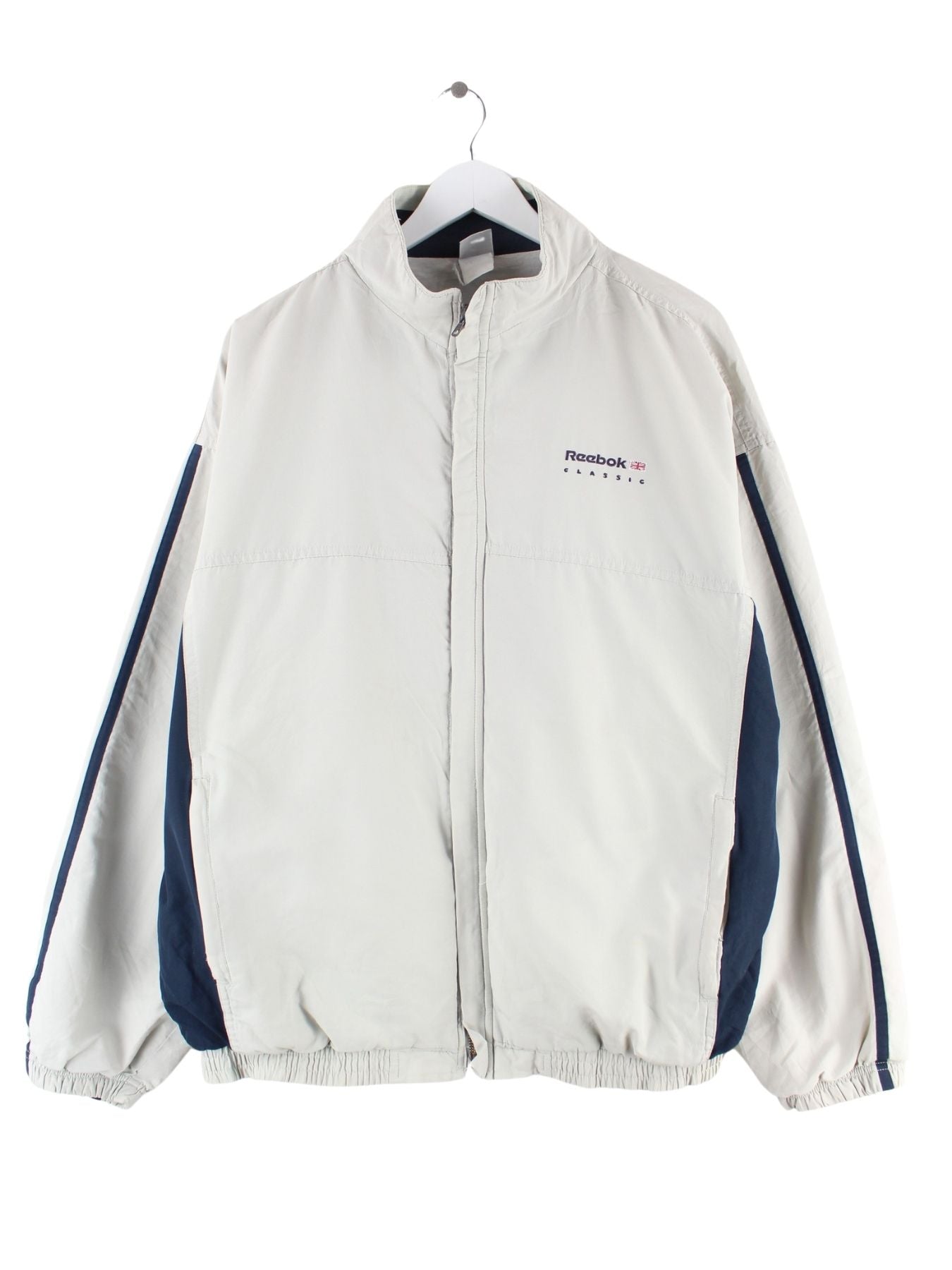 Beigefarbene Trainingsjacke von Reebok in Größe XL. Sie ist aus Synthetik gemacht und in gutem Zustand bei uns vorrätig.