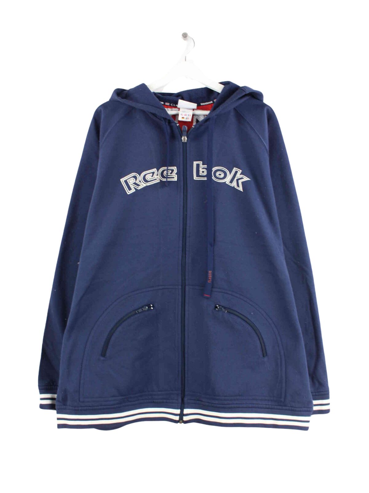 Blue hoodie with embroidered patterns and zip from Reebok from the early 2000s in size XXL. It is made of a cotton blend and is in very good condition.