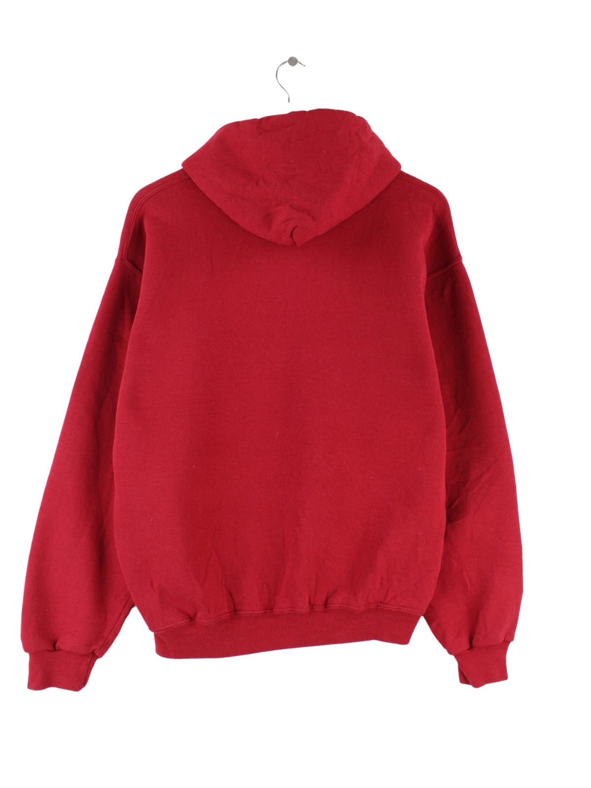 Roter Hoodie der Marke Russell Athletic in Größe M. Er ist aus einer Baumwollmischung produziert und in sehr gutem Zustand bei uns vorrätig. Mit schönem University Print.