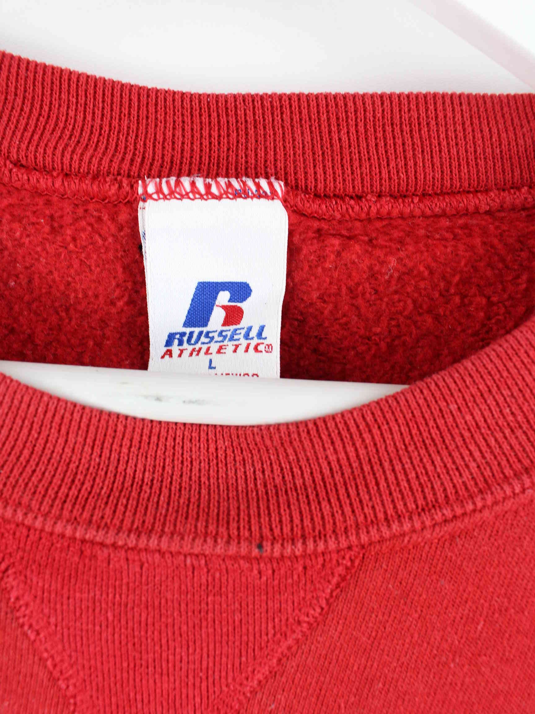 Sweater from the Russell Athletic brand with embroidered motifs in size L. It is made from a cotton blend and is available from us in red.