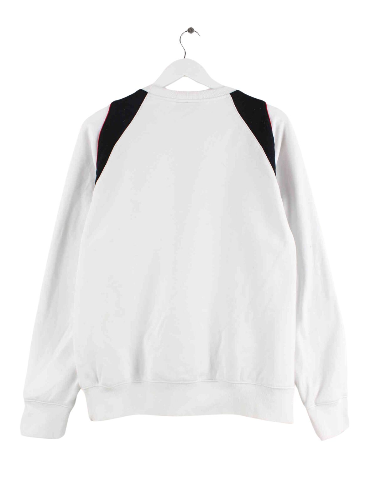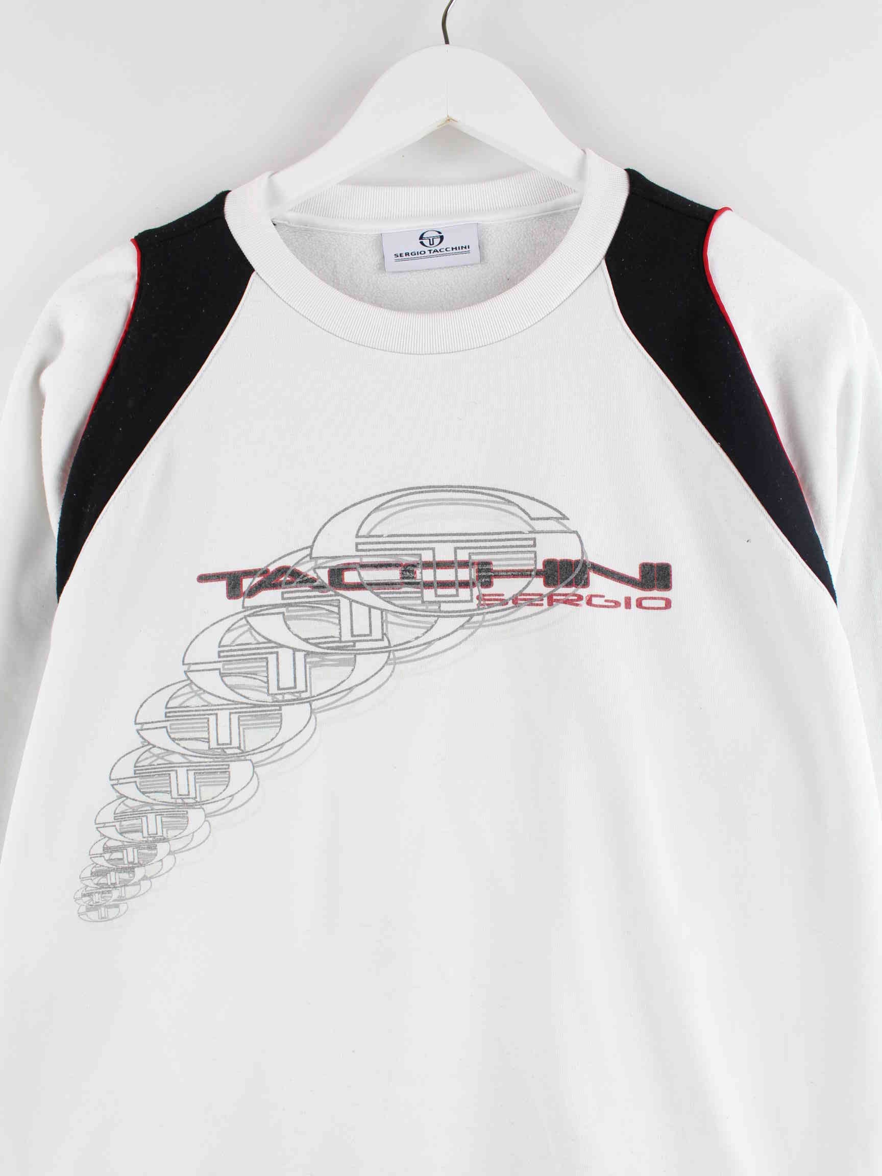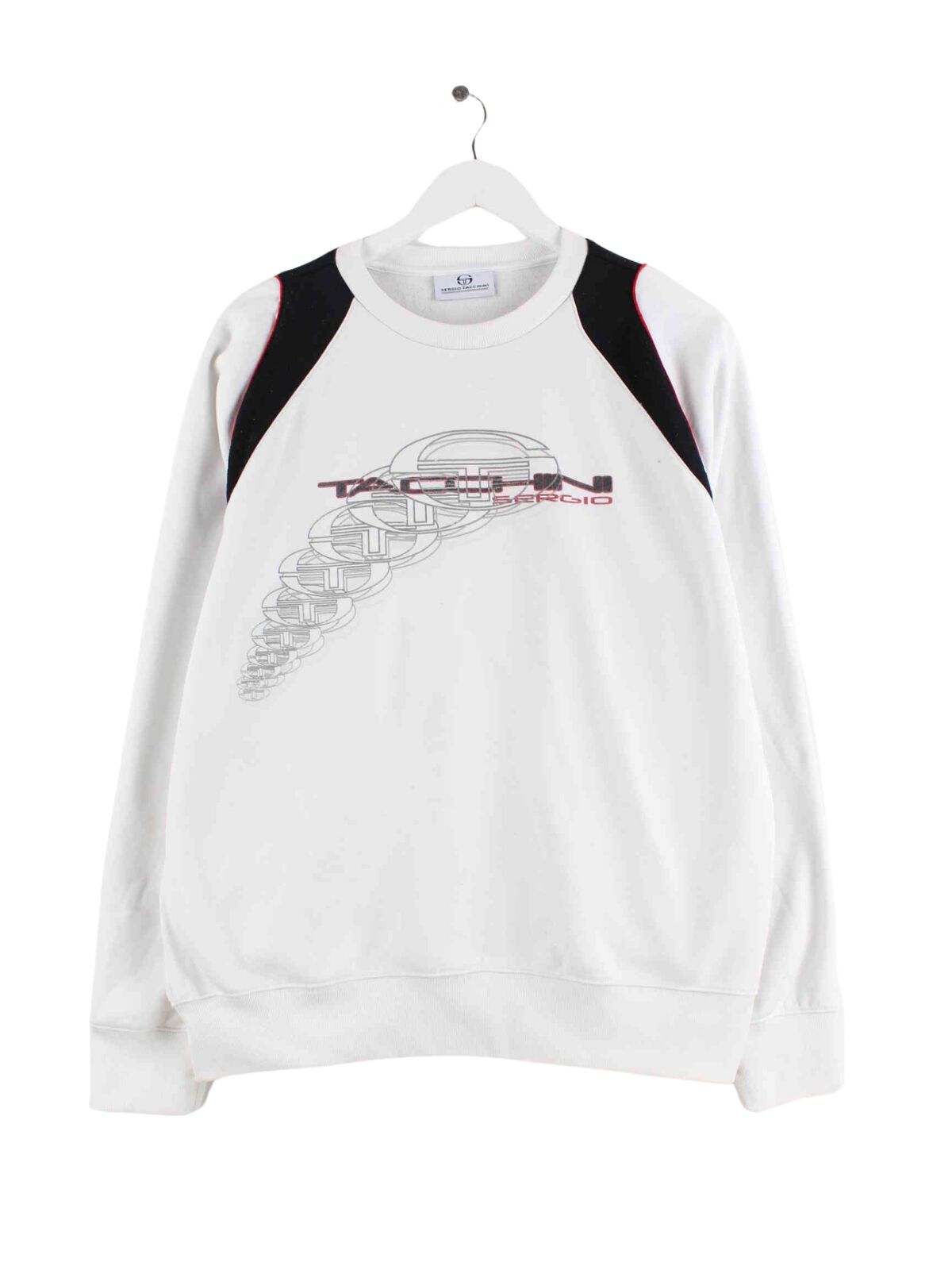 White sweater from the Sergio Tacchini label in size M. It is made from a cotton blend and is available from us in good condition. With a chic print.