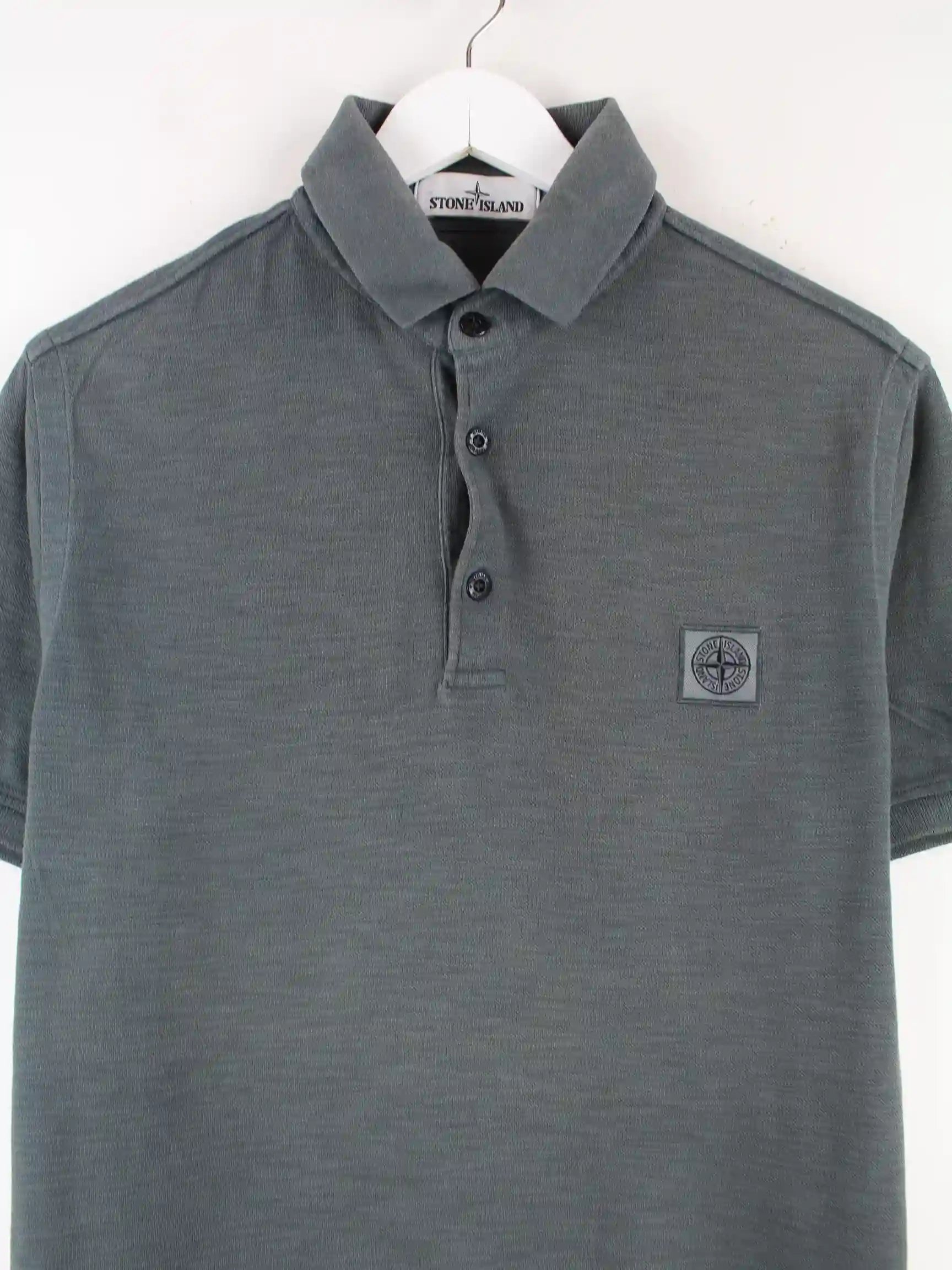 Graues Poloshirt aus dem Hause Stone Island in Größe L. Es ist aus Baumwolle angefertigt und in sehr gutem Zustand bei uns zu bekommen.
