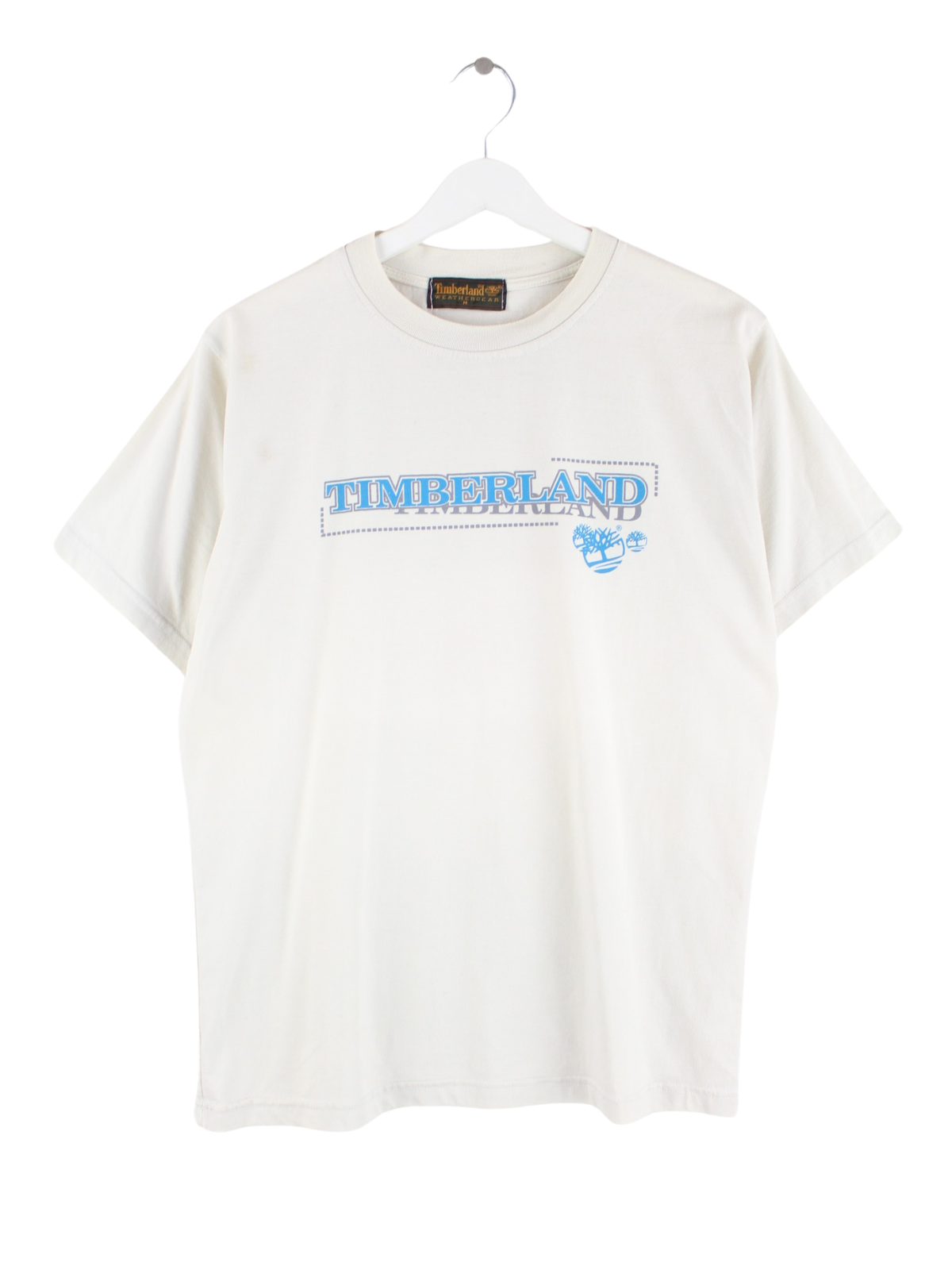 Beige T-shirt from the brand Timberland in size M. It is made of cotton. We would describe the condition as 'fine' (see pictures). With a beautiful vintage print.