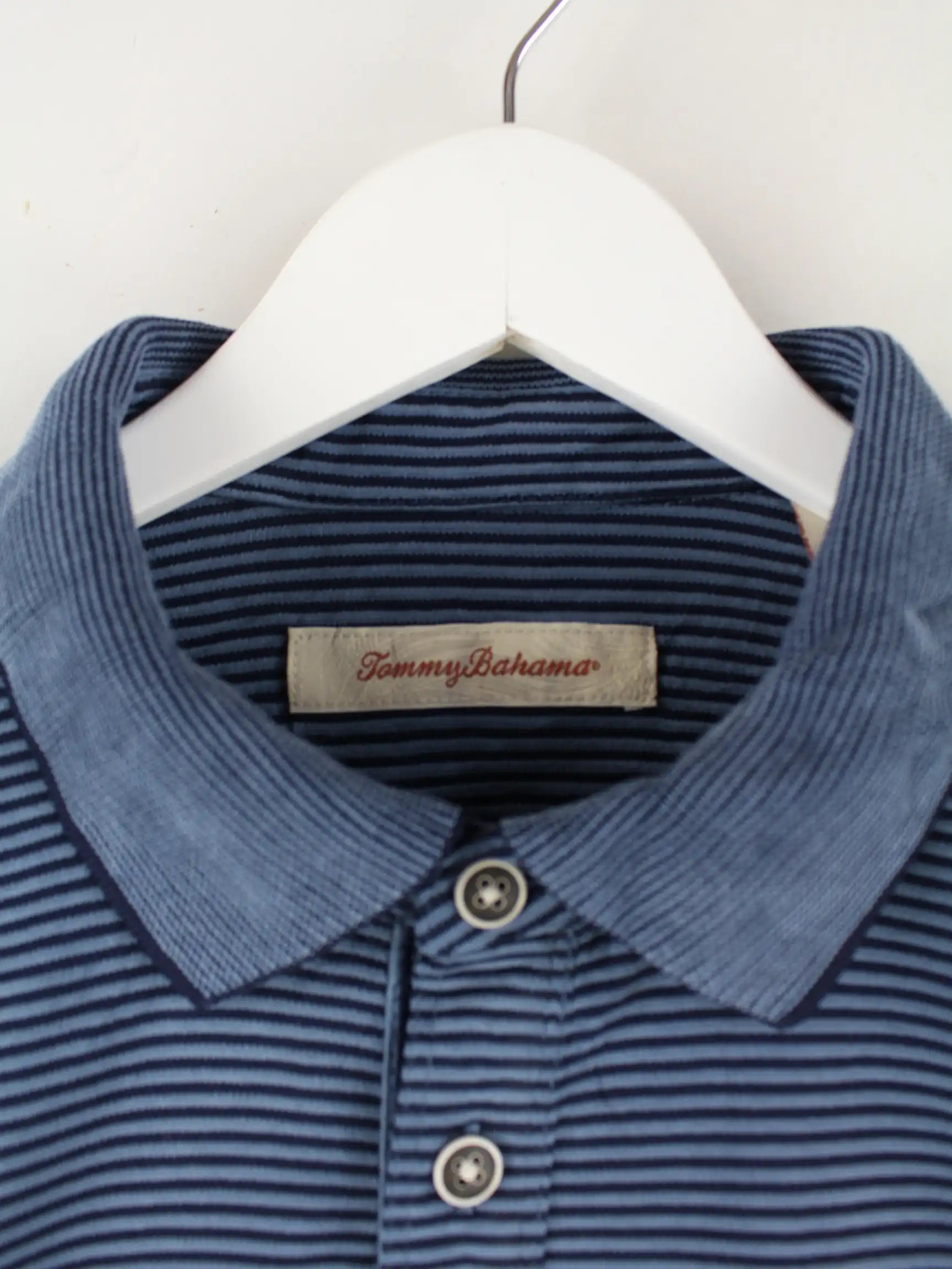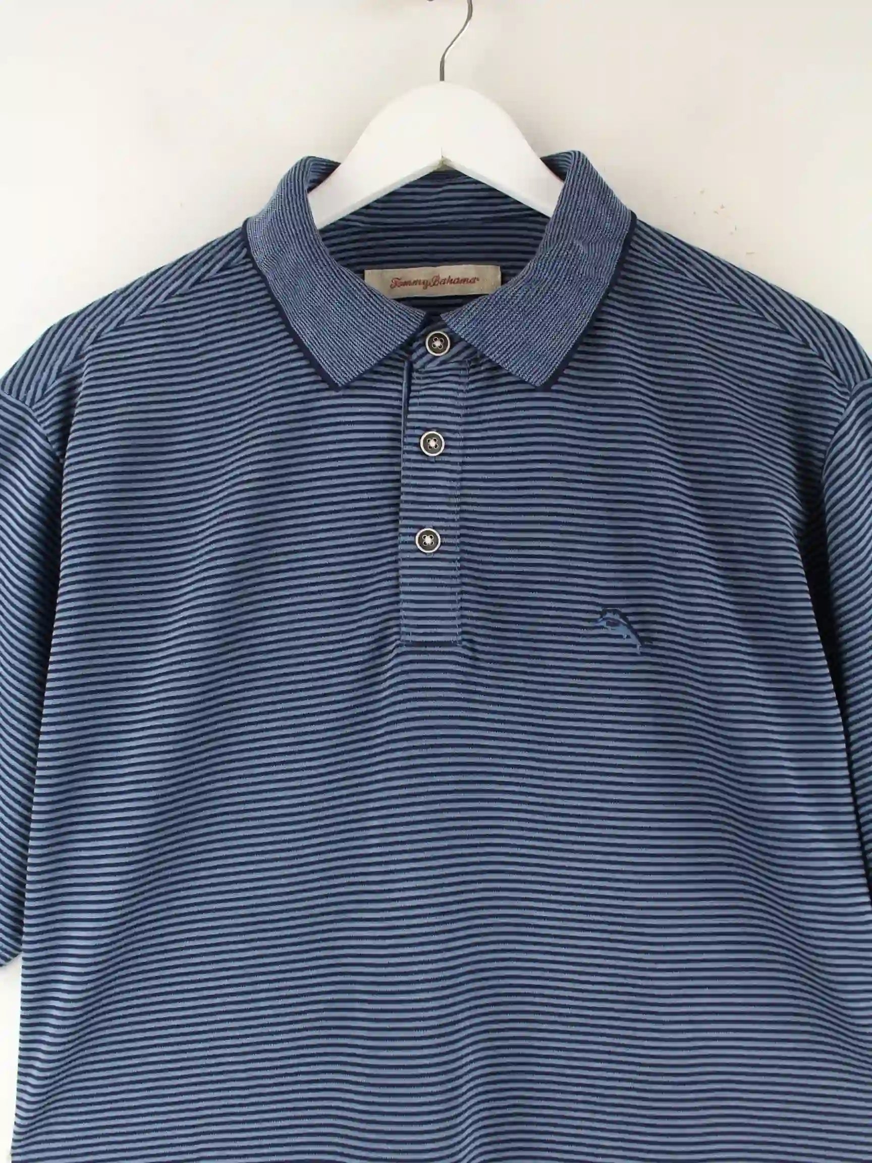 Poloshirt der Marke Tommy Bahama in Größe M. Es ist aus einer Baumwollmischung angefertigt und in Blau bei uns vorrätig.