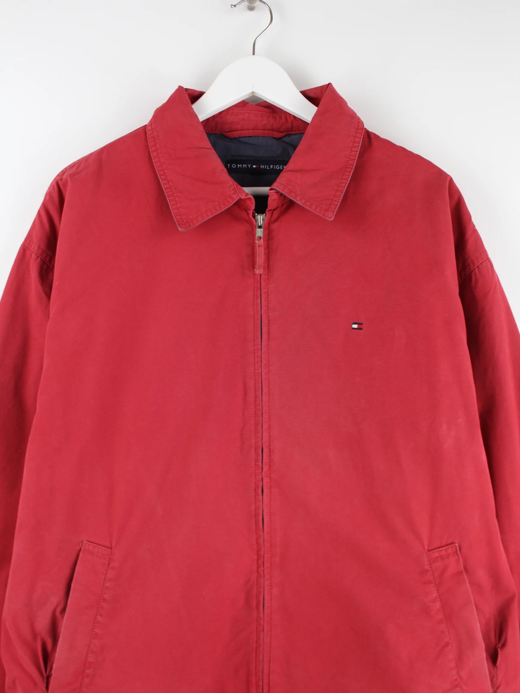 Harrington Jacke vom Label Tommy Hilfiger in Größe L. Sie ist aus einer Baumwollmischung gefertigt und in Rot auf Lager.