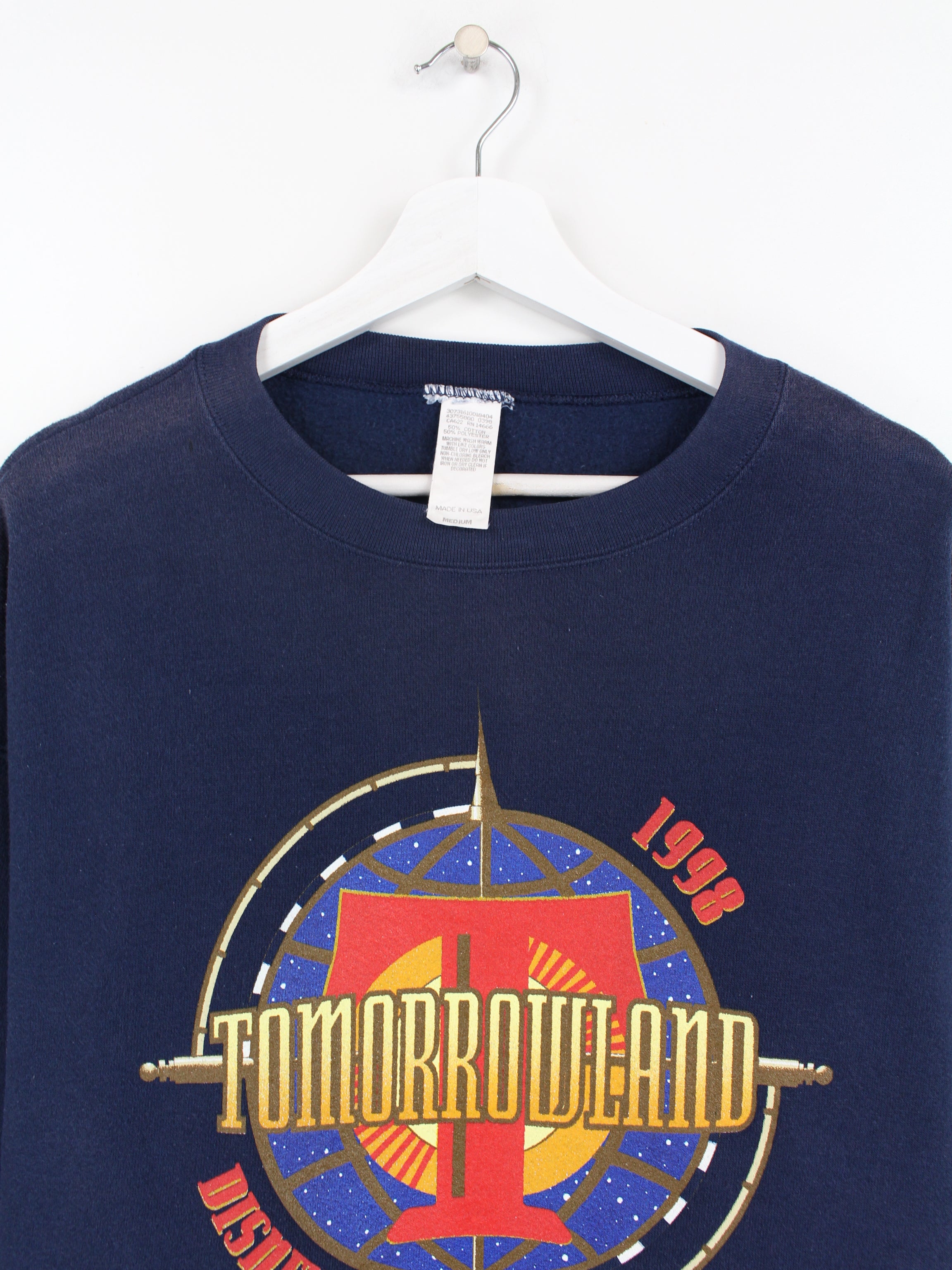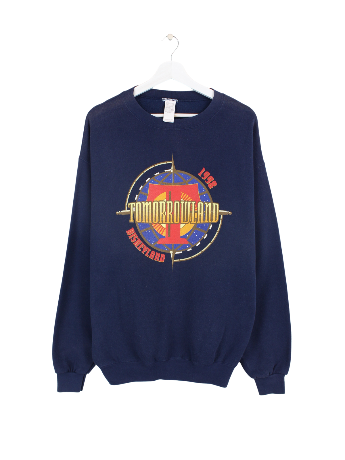 Blue sweater with a large Tomorrowland print on the front.
