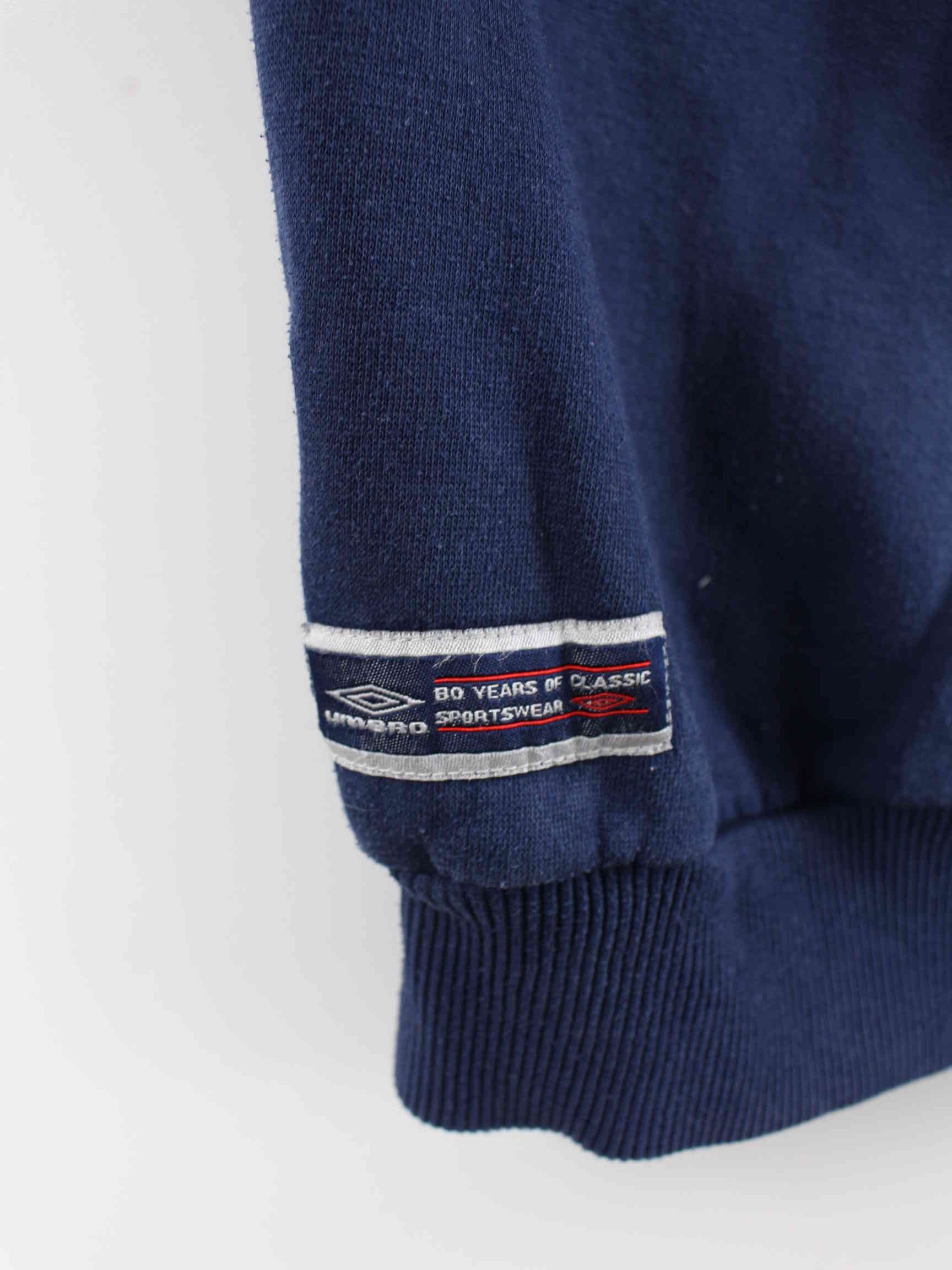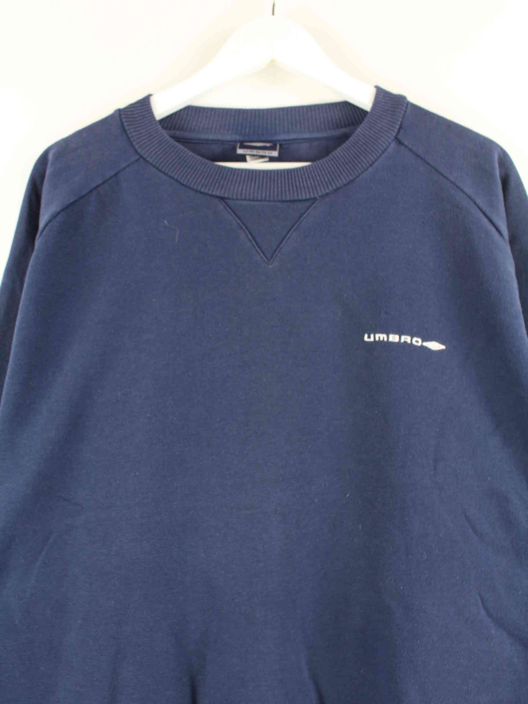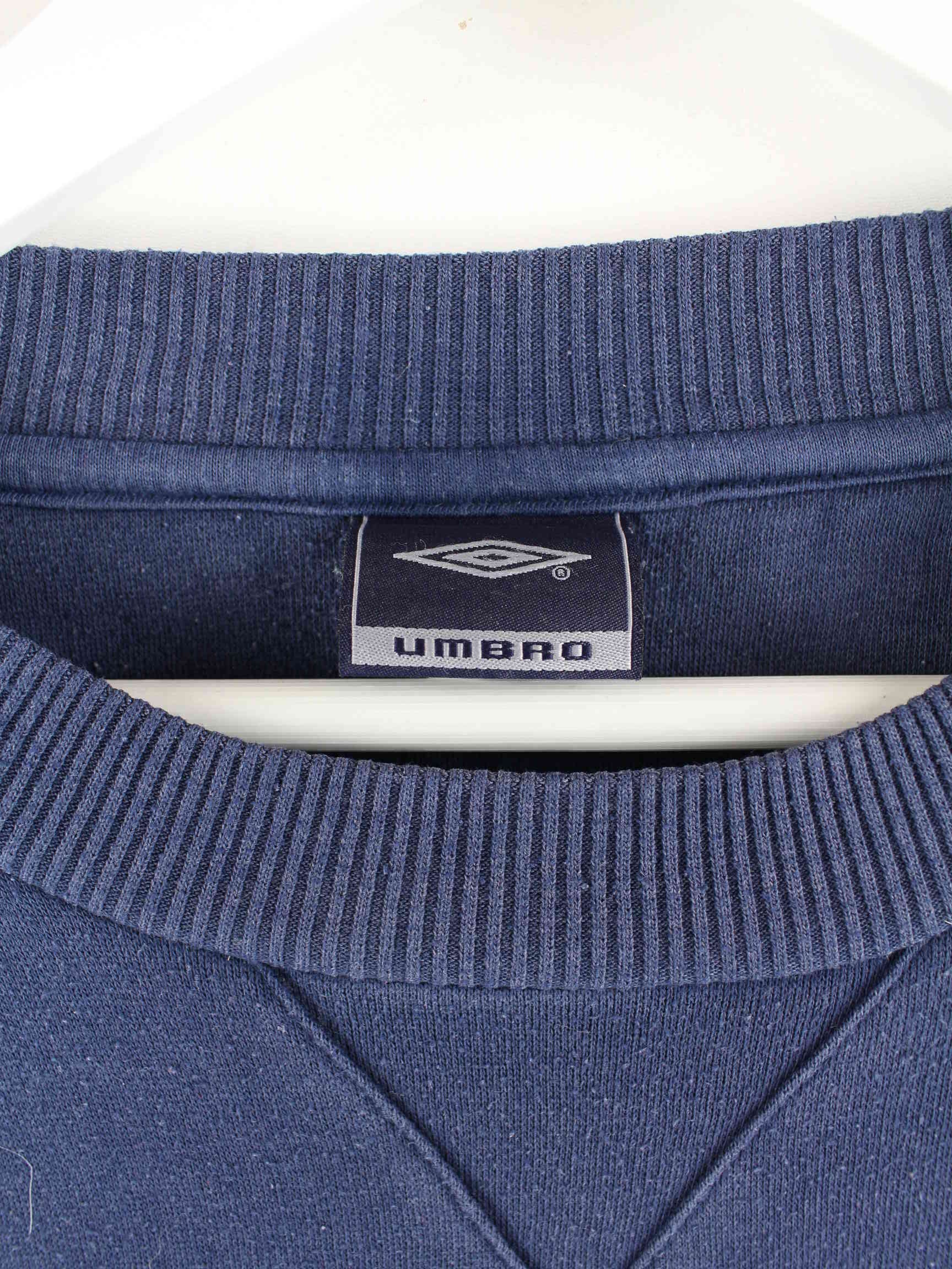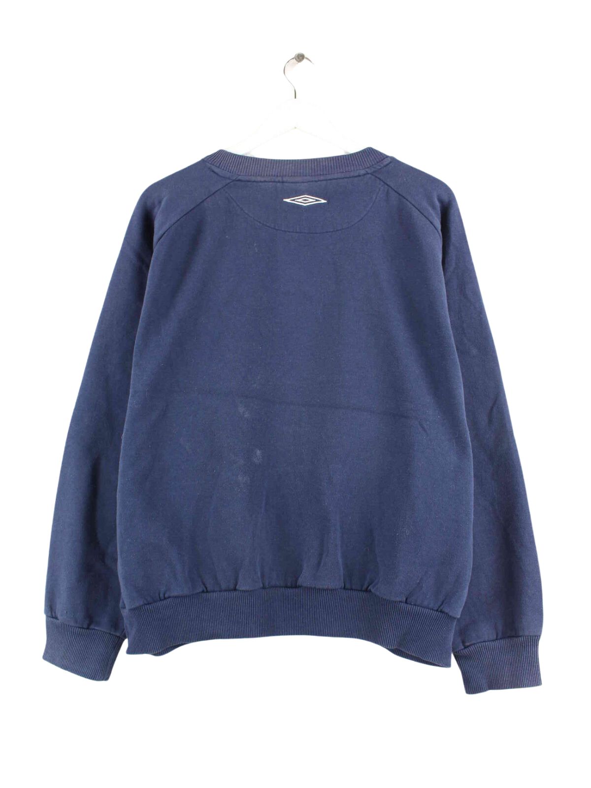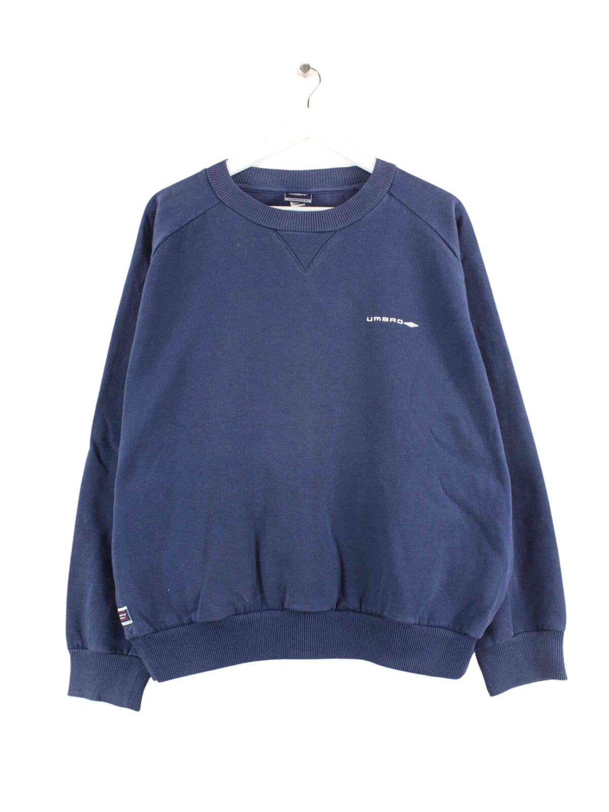 Sweater from the Umbro label with an embroidered logo in size L from the early 2000s. It is made of a cotton blend and comes in blue in stock.