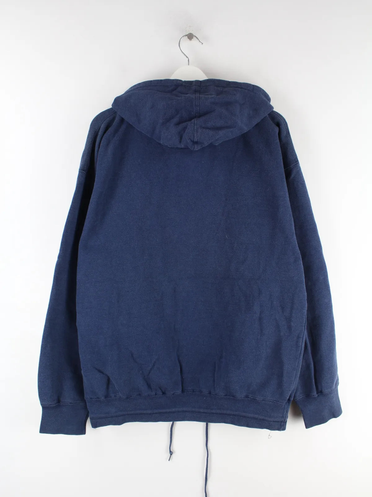 Blauer Vintage Hoodie mit gestickten Motiven und kurzem Reißverschluß in Größe L. Er ist aus einer Baumwollmischung gefertigt und in gutem Zustand in Stock.