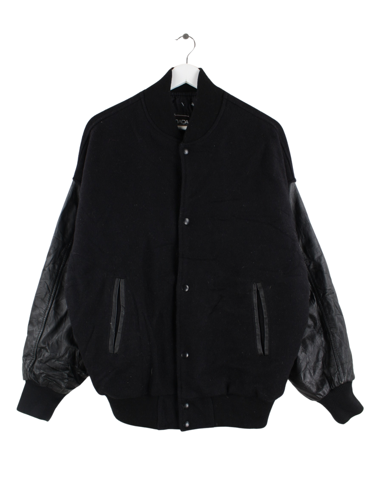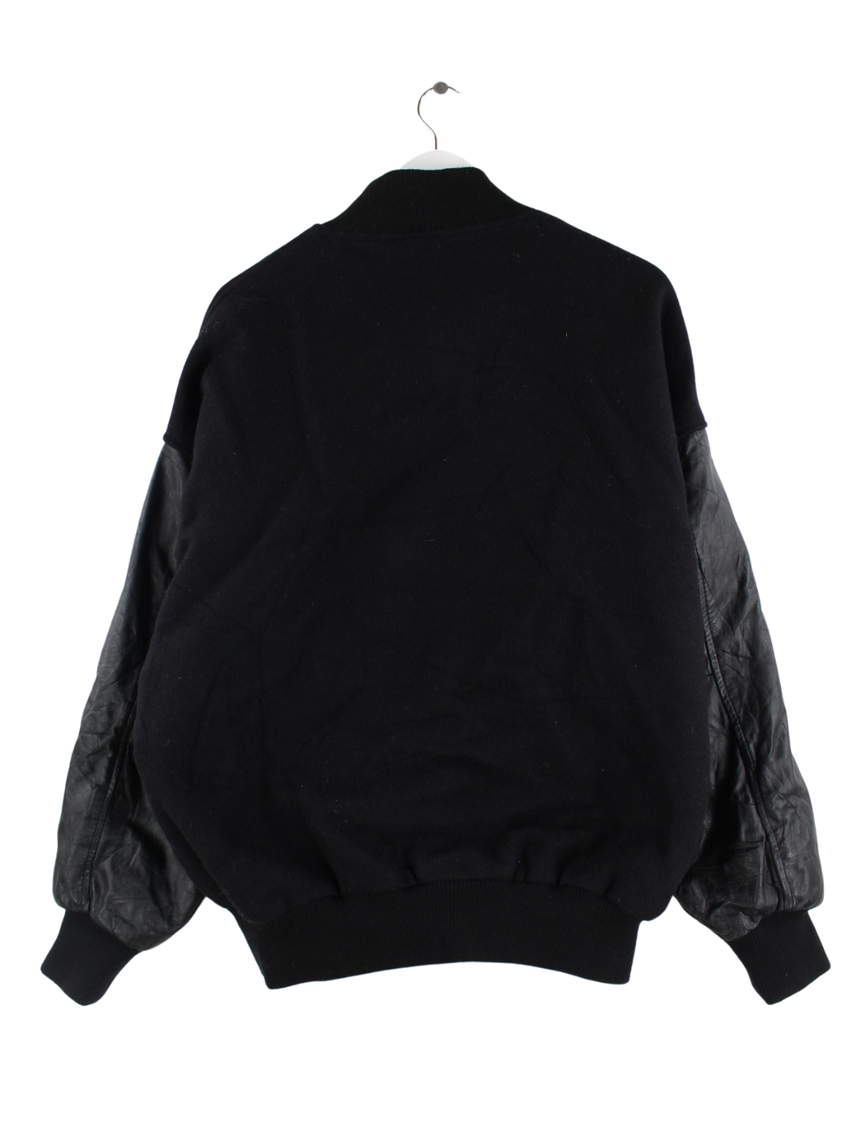 Schwarze Vintage Collegejacke mit Lederärmeln in Größe XL.