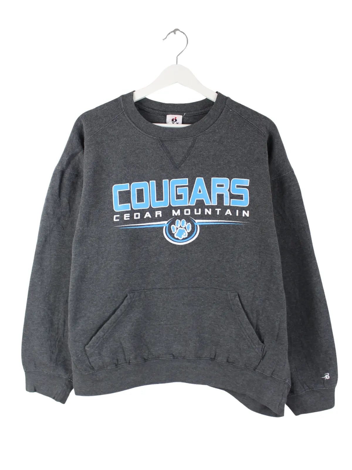 Vintage Sweater in Größe L. Er ist aus einer Baumwollmischung gefertigt und in Grau bei uns vorrätig. Mit schickem Cougars Print.