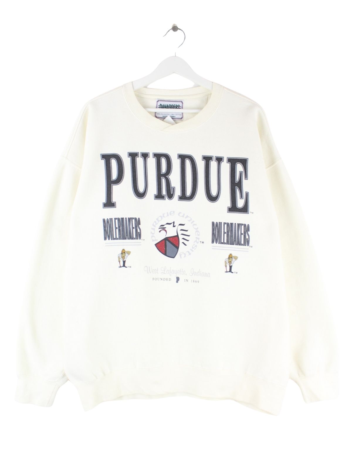 Vintage Sweater in Größe XL. Er ist aus einer Baumwollmischung angefertigt und in Beige bei uns vorrätig. Mit tollem Boilermakers Print.