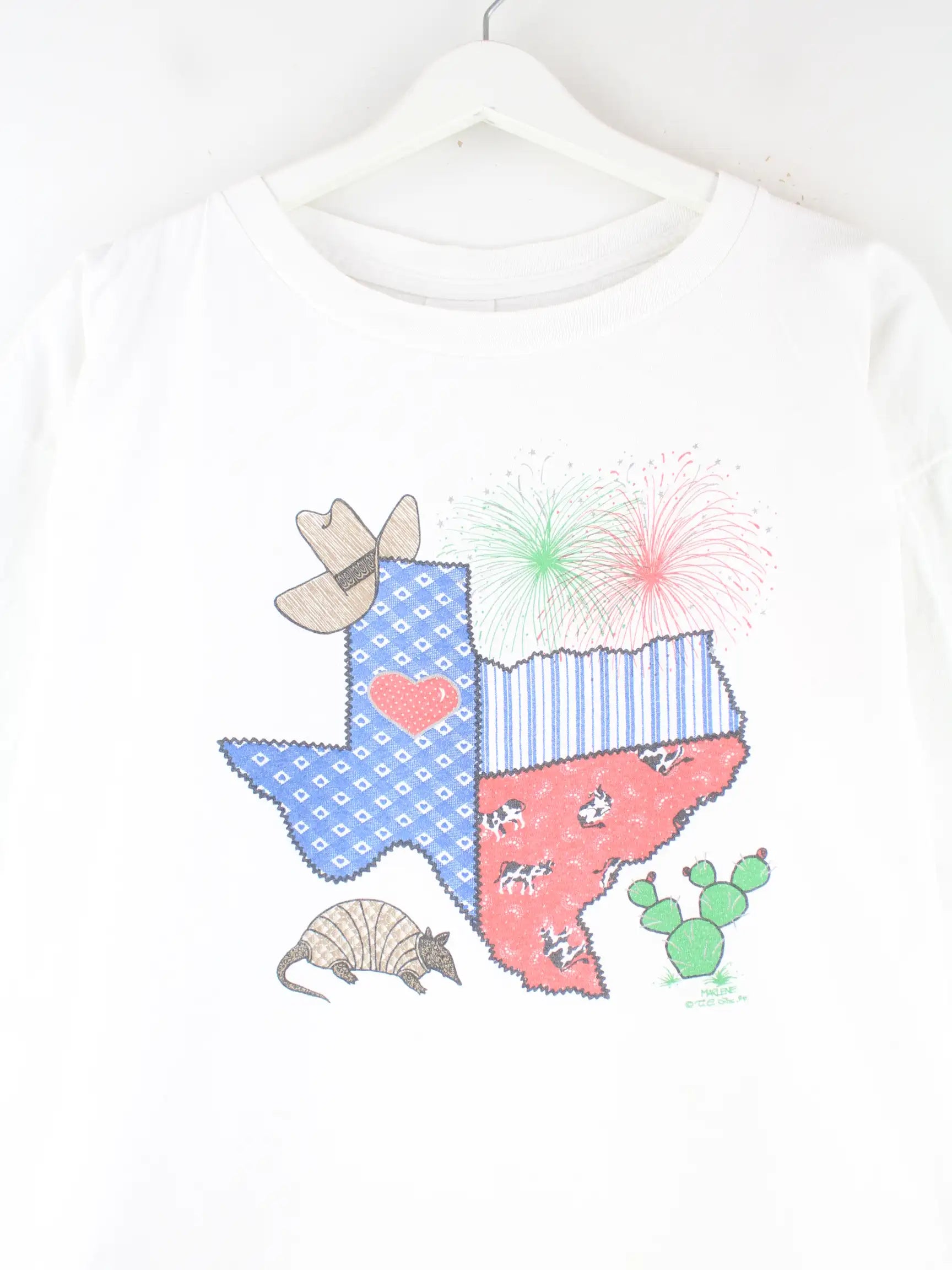 Weißes Vintage T-Shirt in Größe XL. Es ist aus Baumwolle . Den Zustand würden wir als 'In Ordnung' bezeichnen (vergl. Bilder).Mit seltenem Texas Print.