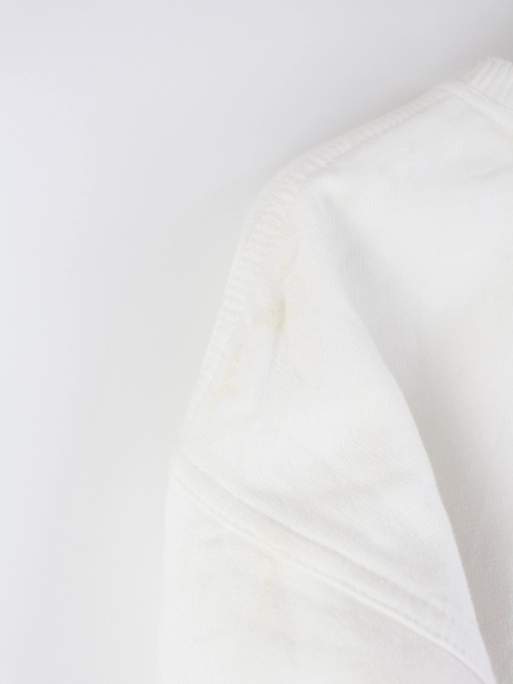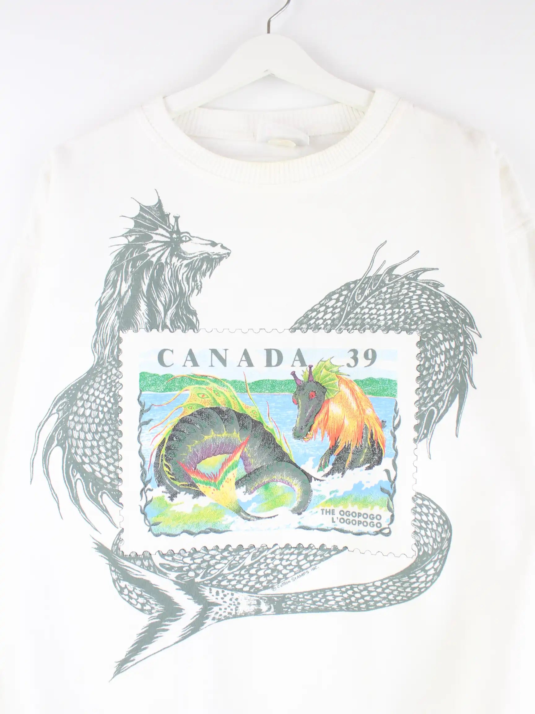 Weißer Vintage Sweater aus den 80'ern in Größe M. Er ist aus einer Baumwollmischung angefertigt und in gutem Zustand bei uns zu bekommen. Mit tollem Canada Print.
