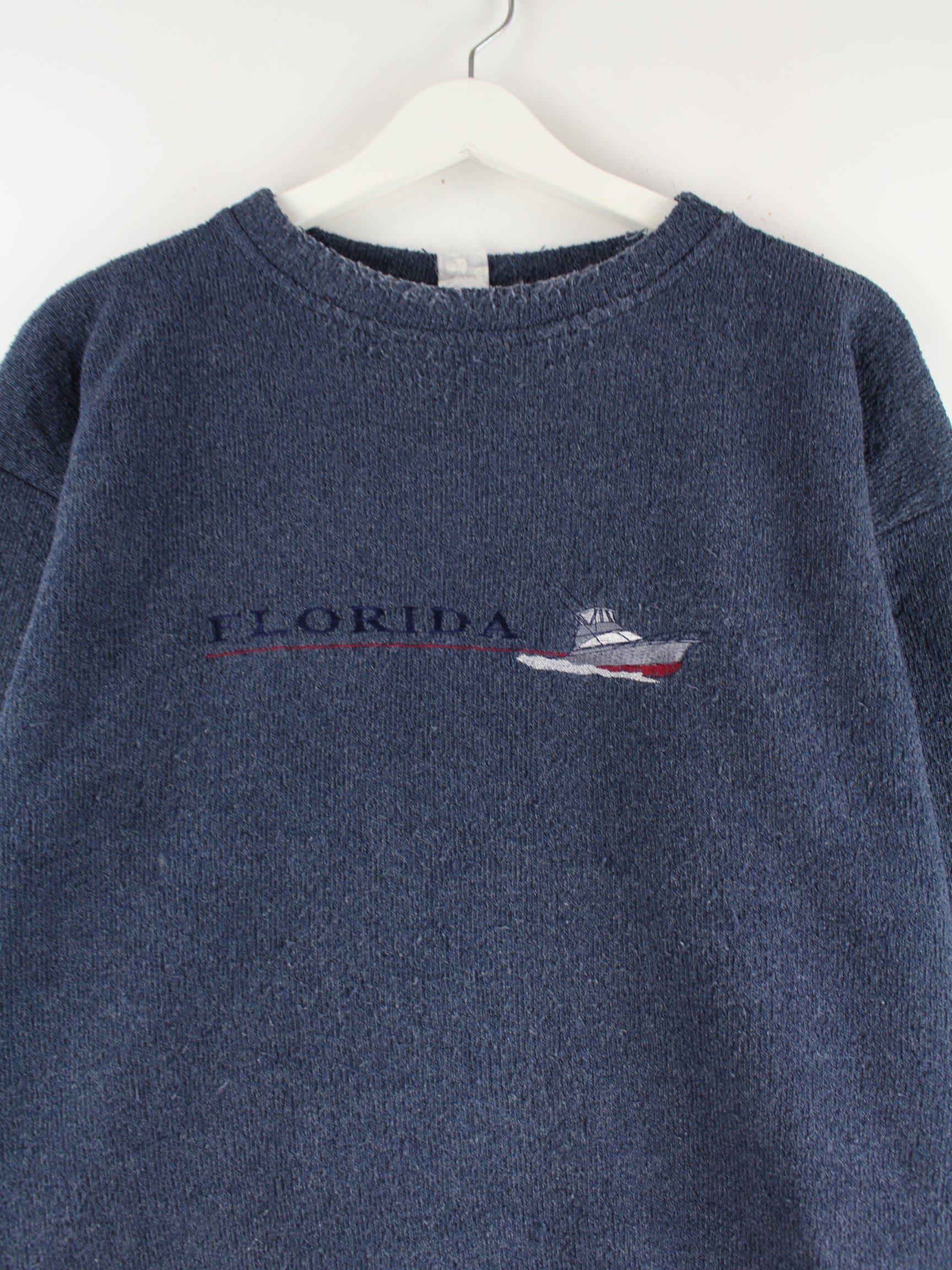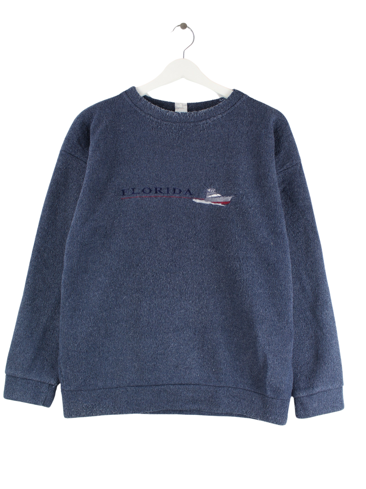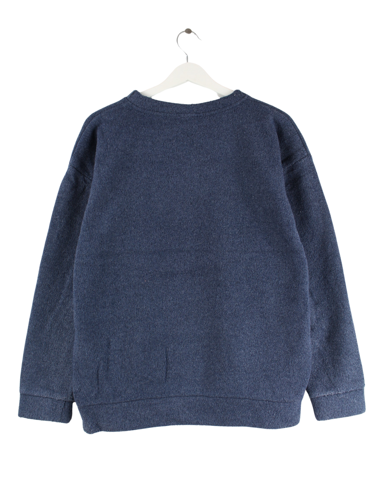Vintage Sweater mit gesticktem Logo in Größe S aus den 80'ern. Er ist aus einer Baumwollmischung produziert und in Blau zu bekommen.