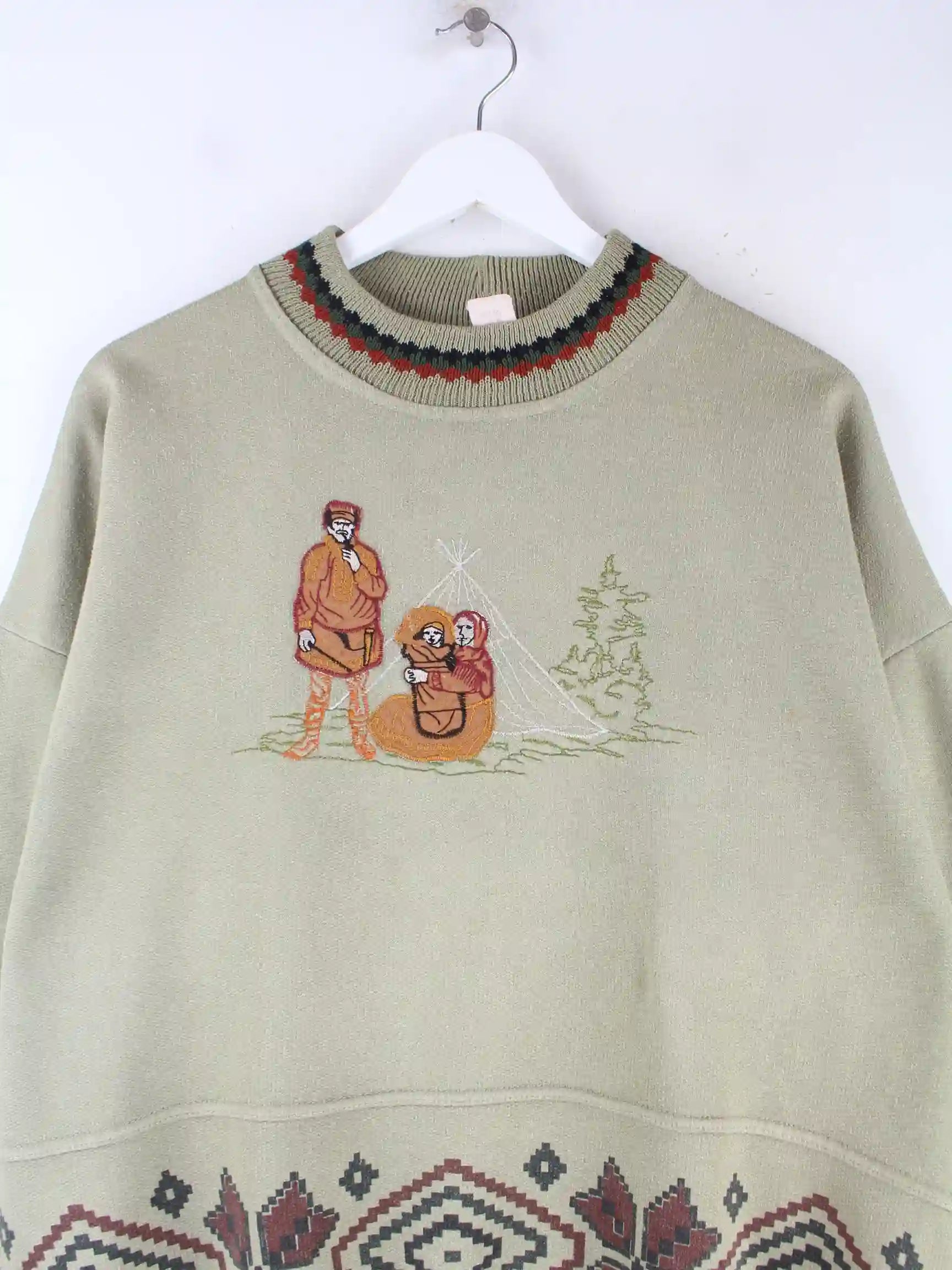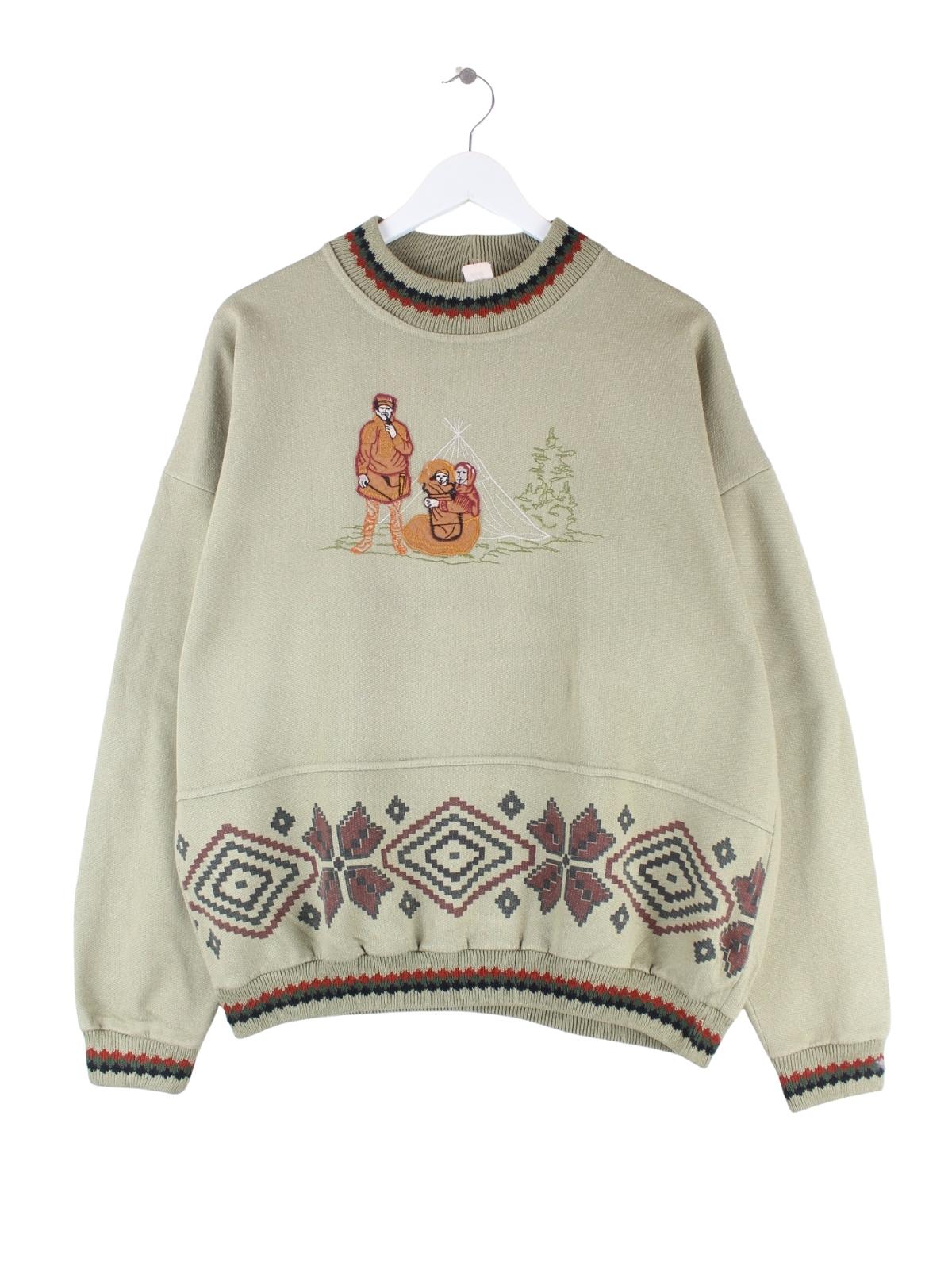 Grauer Vintage Sweater mit gestickten Motiven aus den 80'ern in Größe M. Er ist aus einer Baumwollmischung gefertigt und in sehr gutem Zustand zu bekommen.