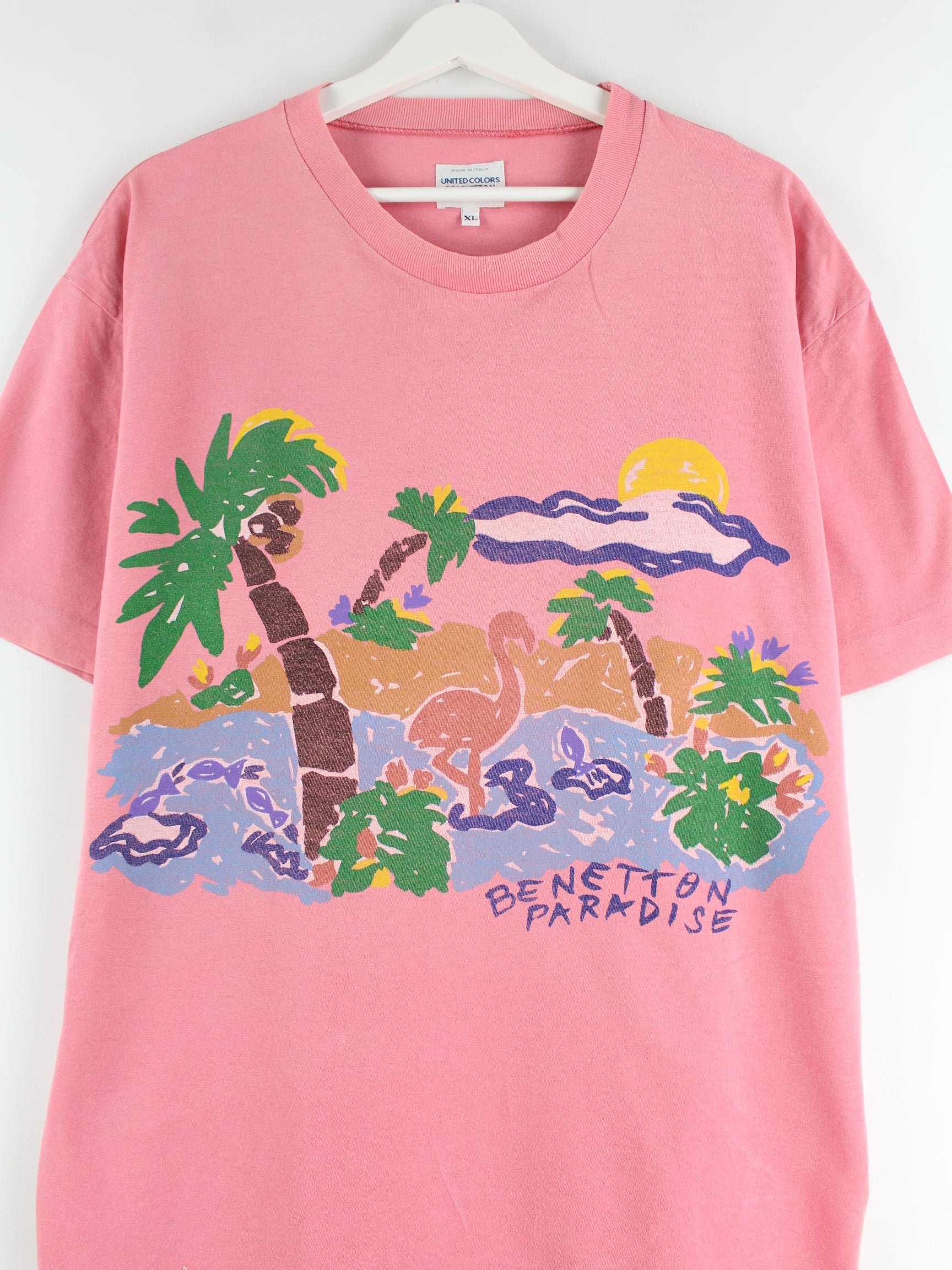 Pink vintage T-shirt from the 80's in size XL. It is made of cotton and is available from us in good condition. With a beautiful Paradise print.