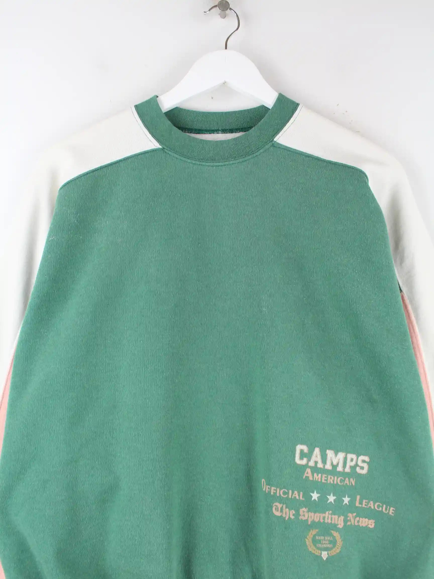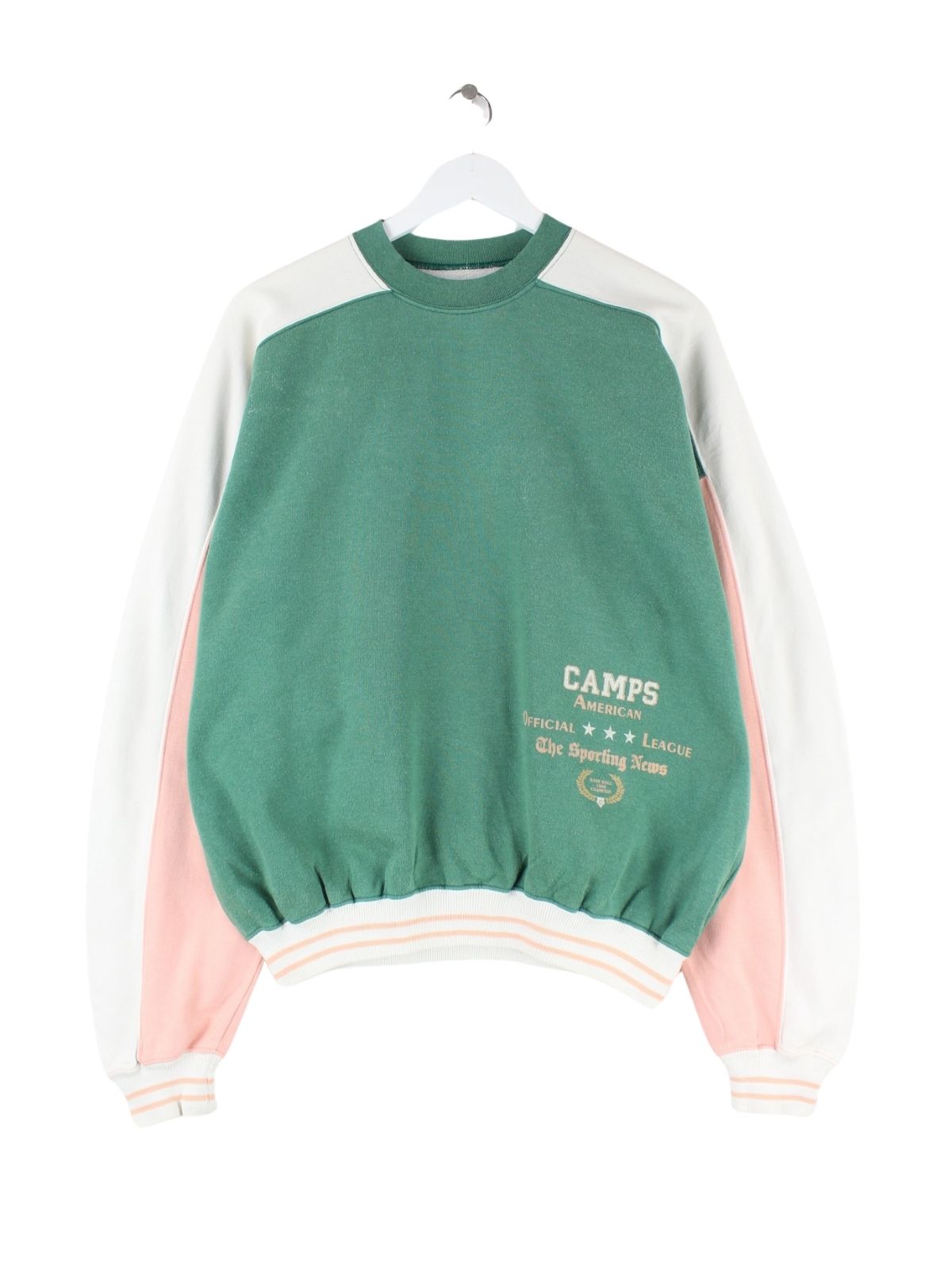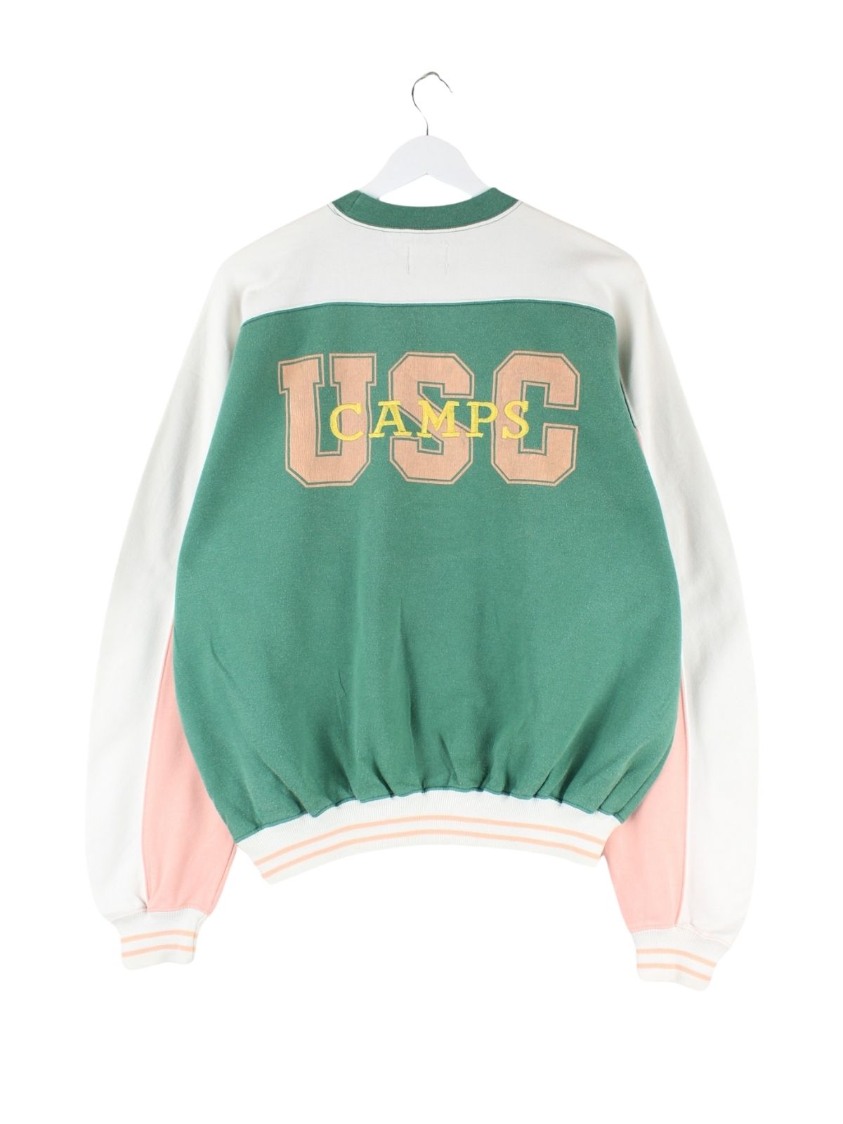 Vintage Sweater in Größe M aus den 80'ern. Er ist aus einer Baumwollmischung hergestellt und in Grün im Bestand. Mit chiquem Camps Print.