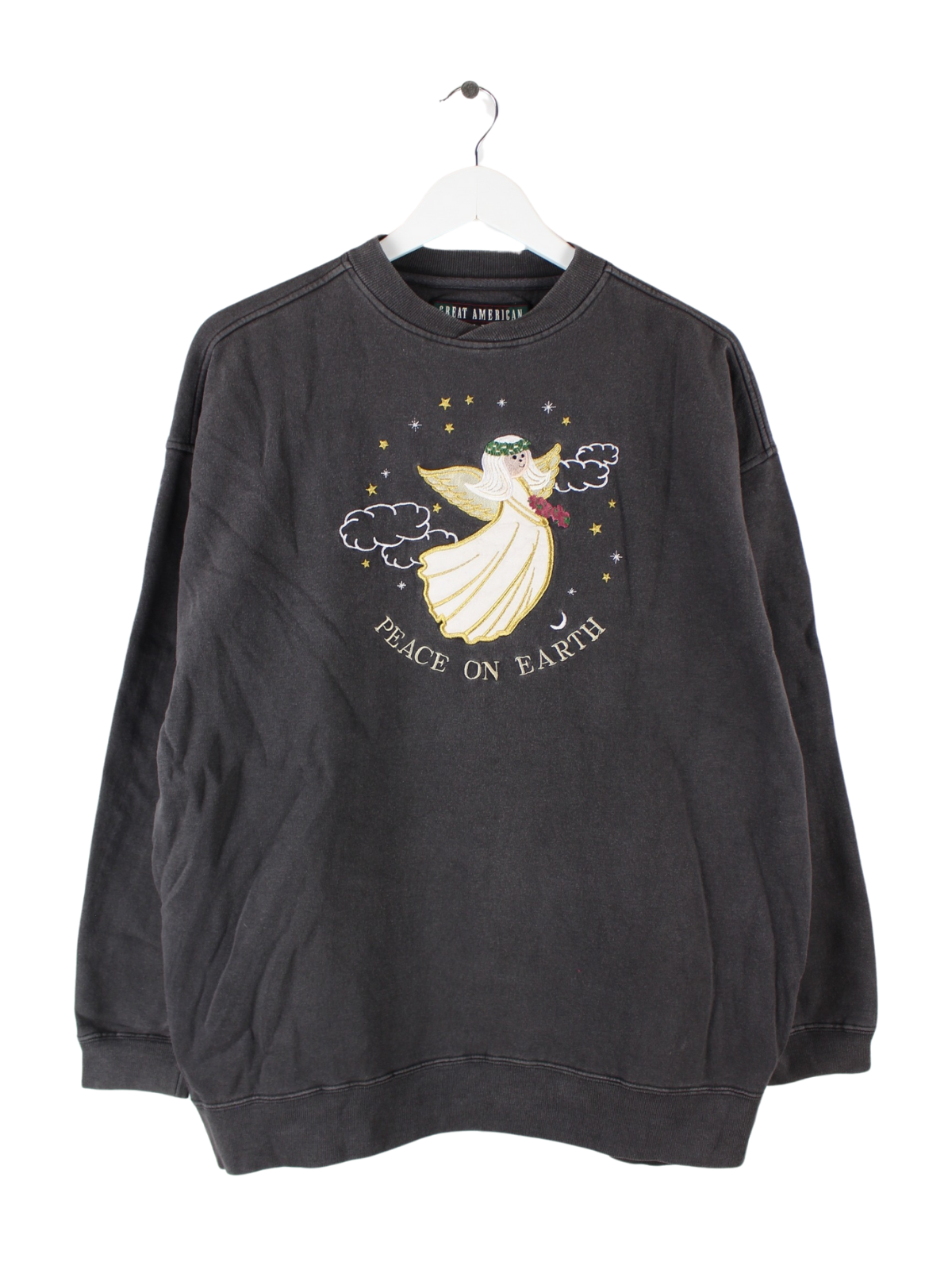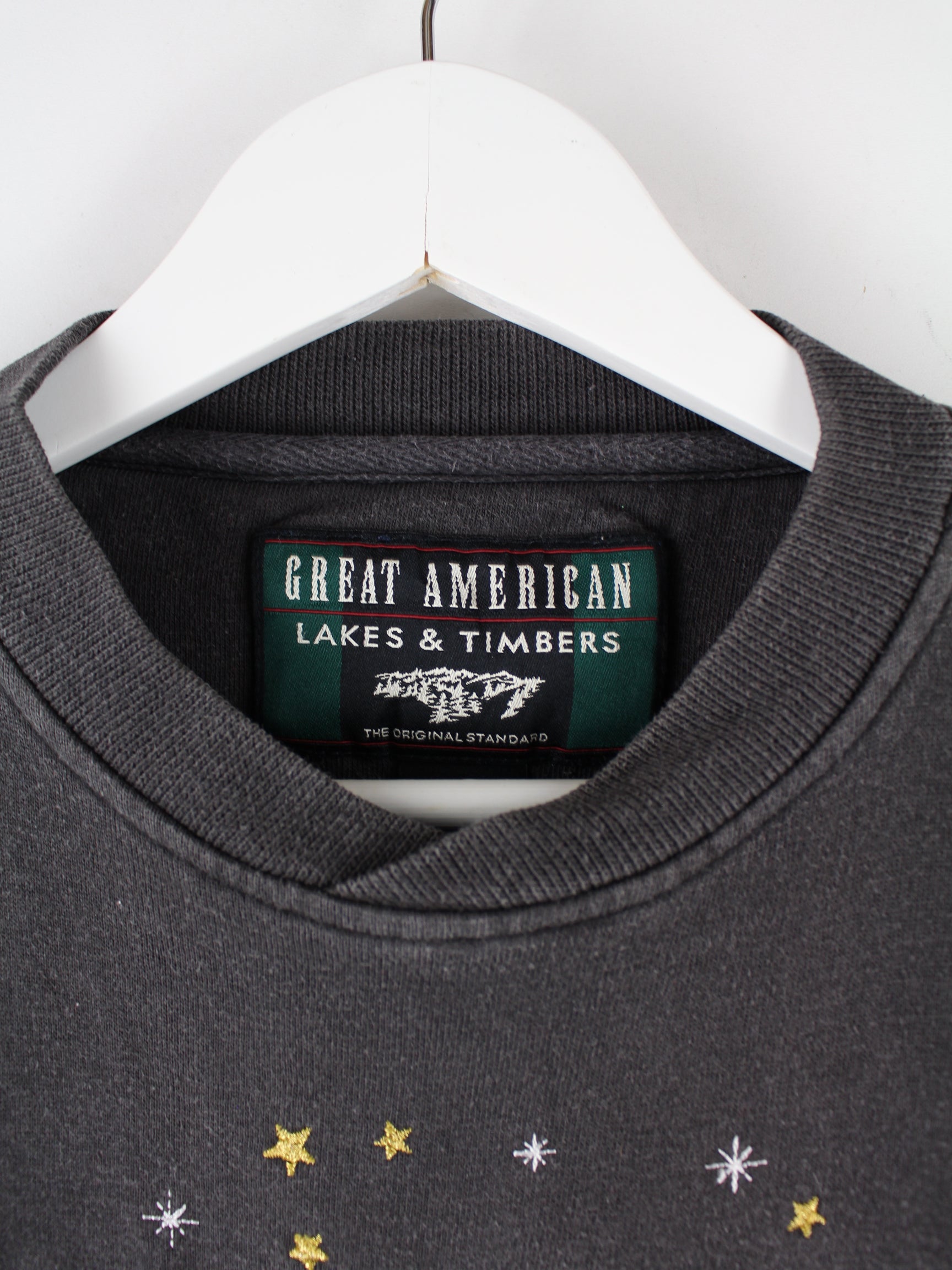 Grauer Vintage Sweater mit gesticktem Logo aus den 90'ern in Größe XL. Er ist aus einer Baumwollmischung hergestellt und in sehr gutem Zustand zu bekommen.