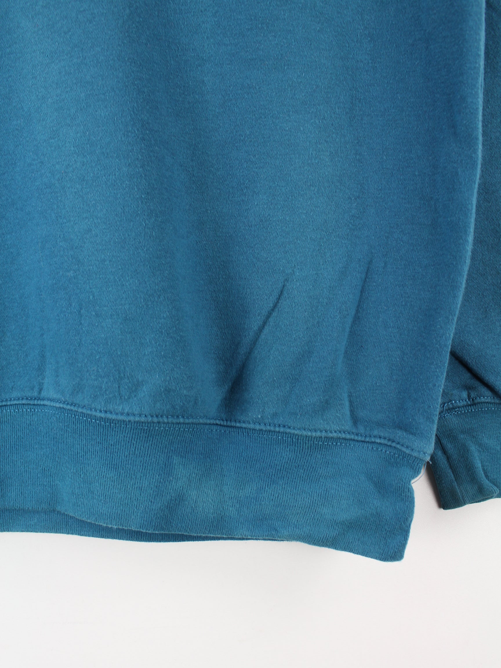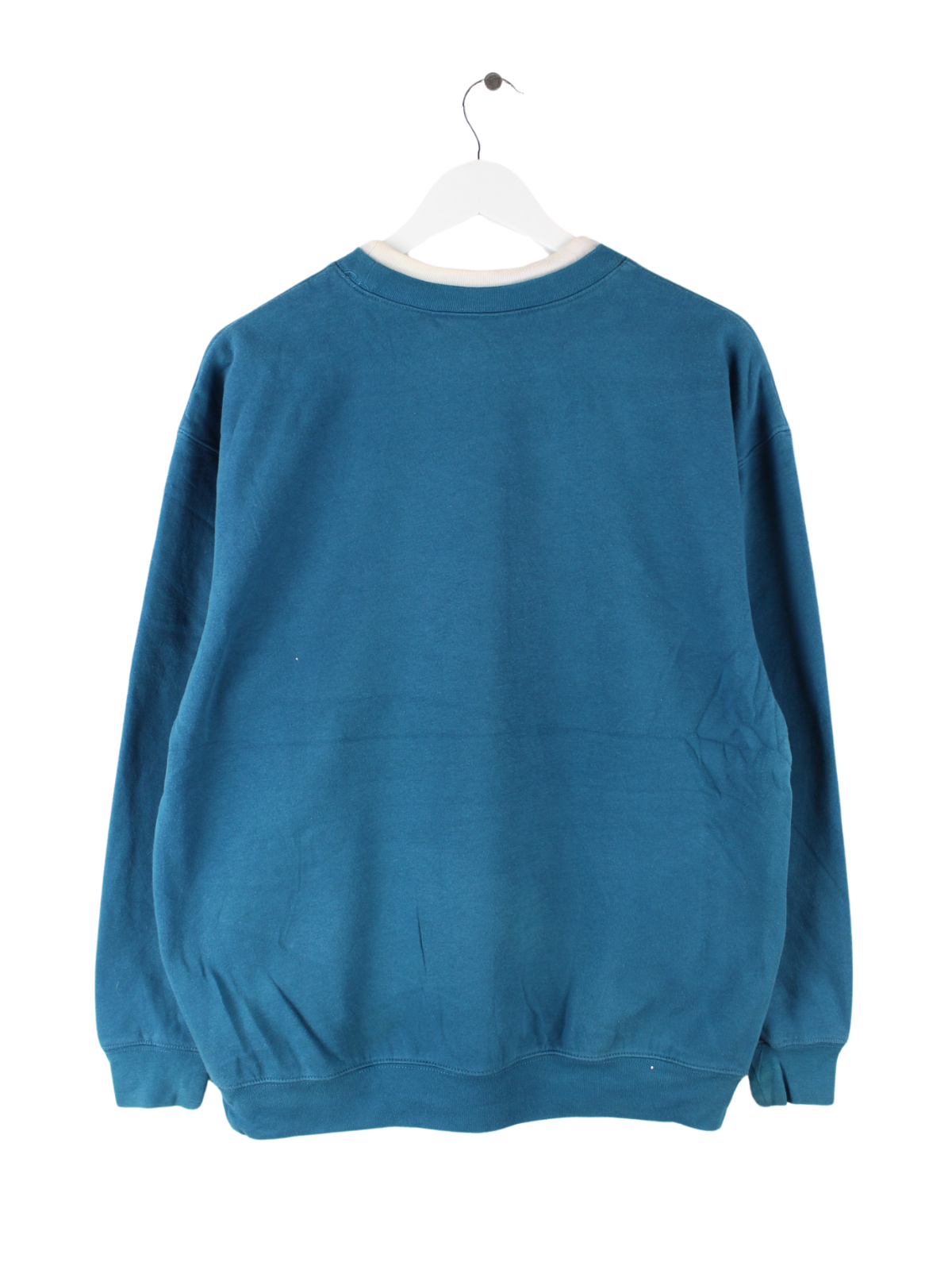 Vintage Sweater mit gestickten Motiven in Größe L aus den 90'ern. Er ist aus einer Baumwollmischung gemacht und in Türkis in Stock.