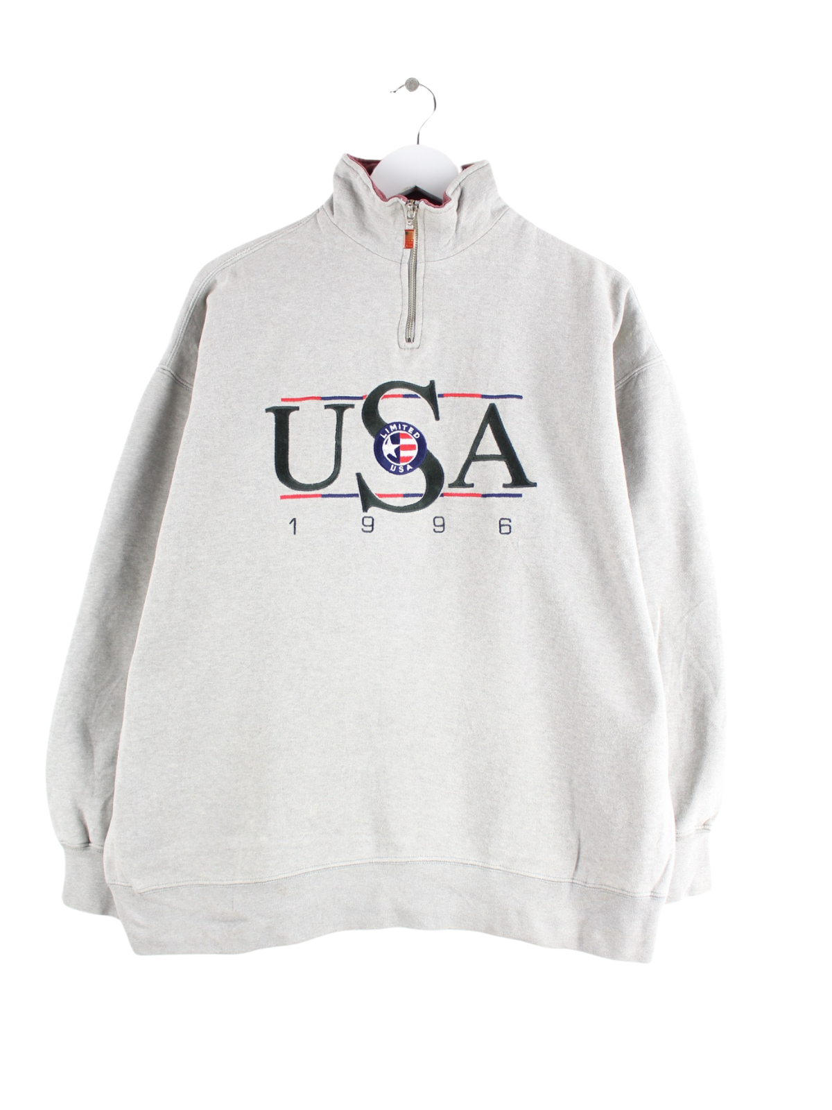 Vintage sweater with embroidery and half zip in size M from the 90's. It is made from a cotton blend and is available in grey.