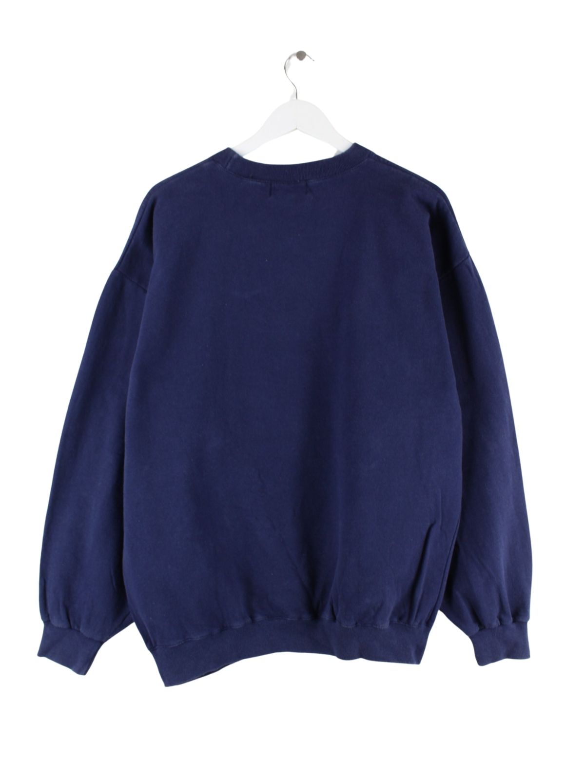 Blauer Vintage Sweater mit gestickten Motiven aus den 90'ern in Größe XL. Er ist aus einer Baumwollmischung gemacht und in sehr gutem Zustand in Stock.