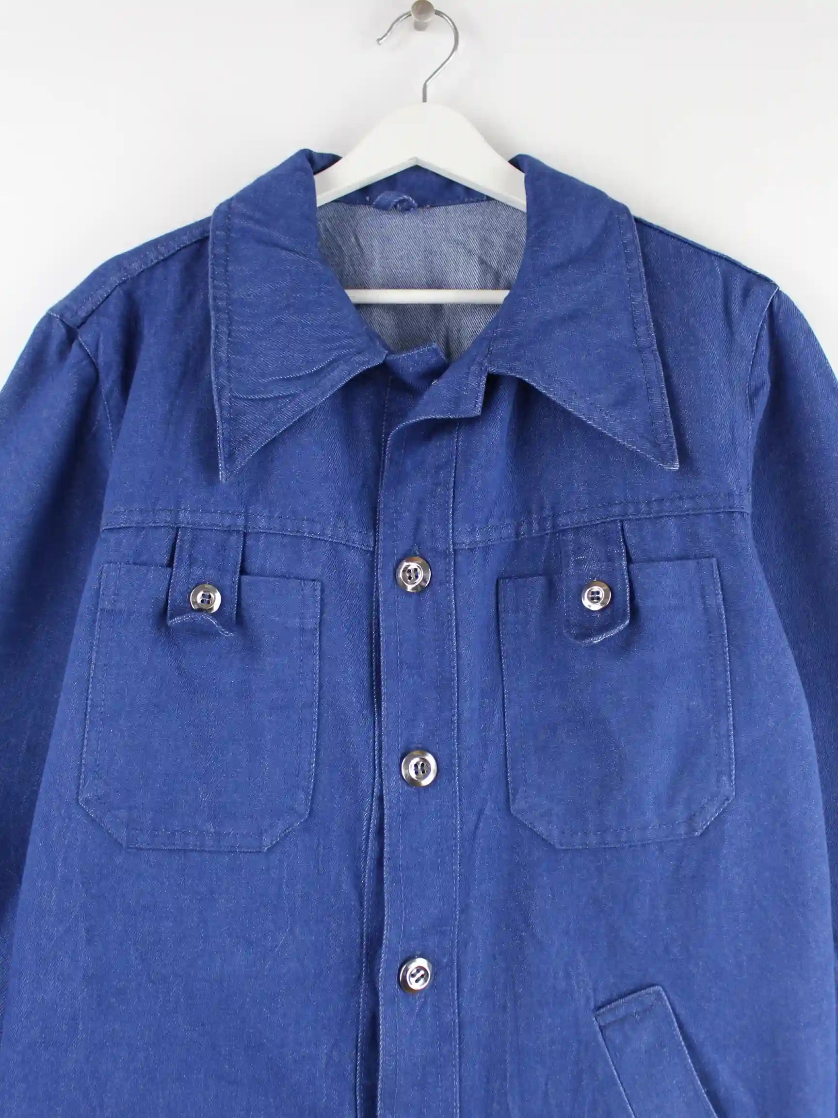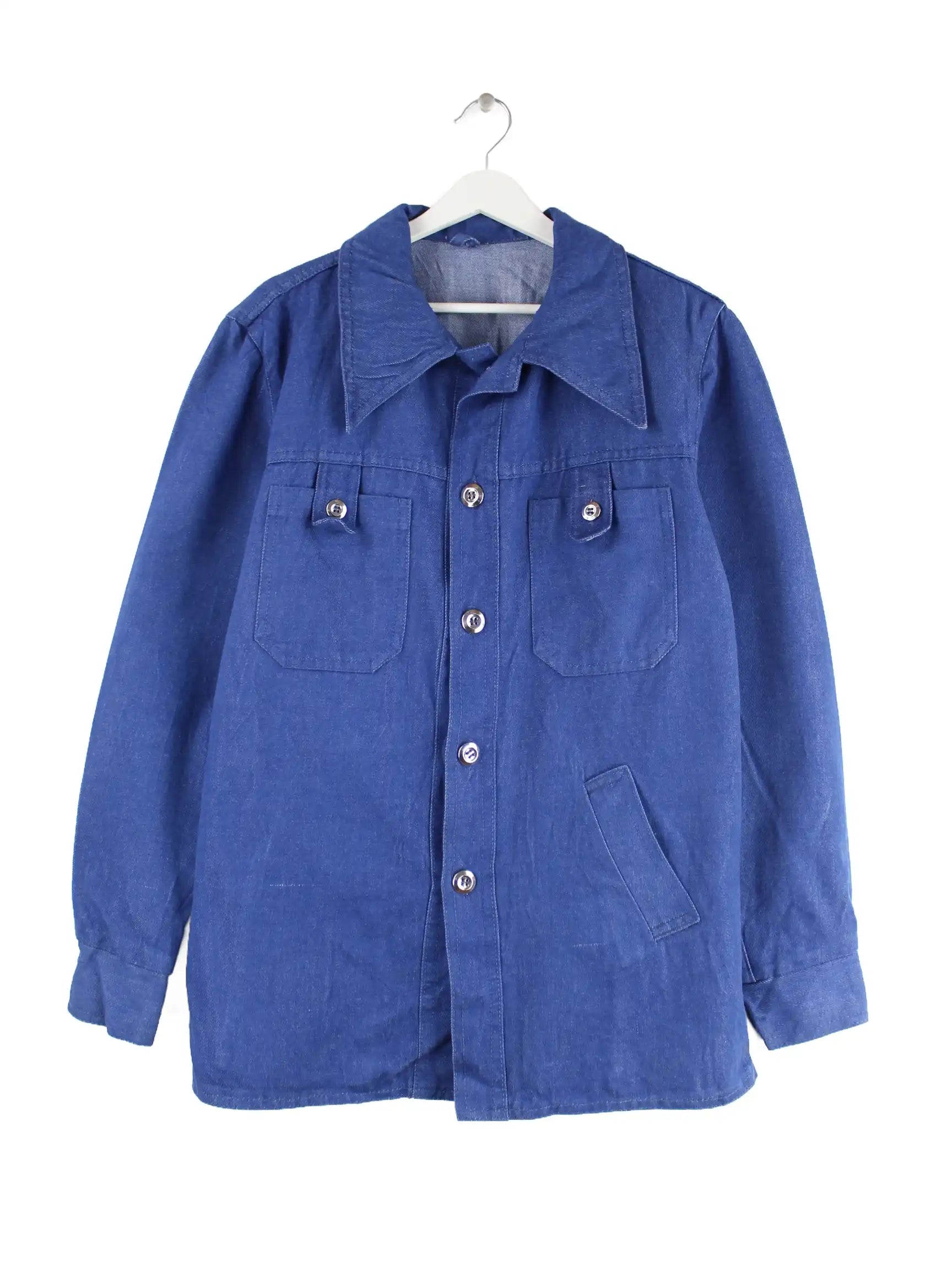 Vintage Jacke in Größe L aus den 90'ern. Sie ist aus Baumwolle hergestellt und in Blau auf Lager.