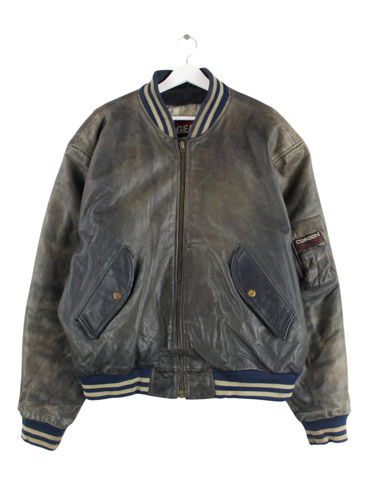 Grey vintage jacket from the 90's in size XL. It is made of leather. We would describe the condition as 'fine' (see pictures).