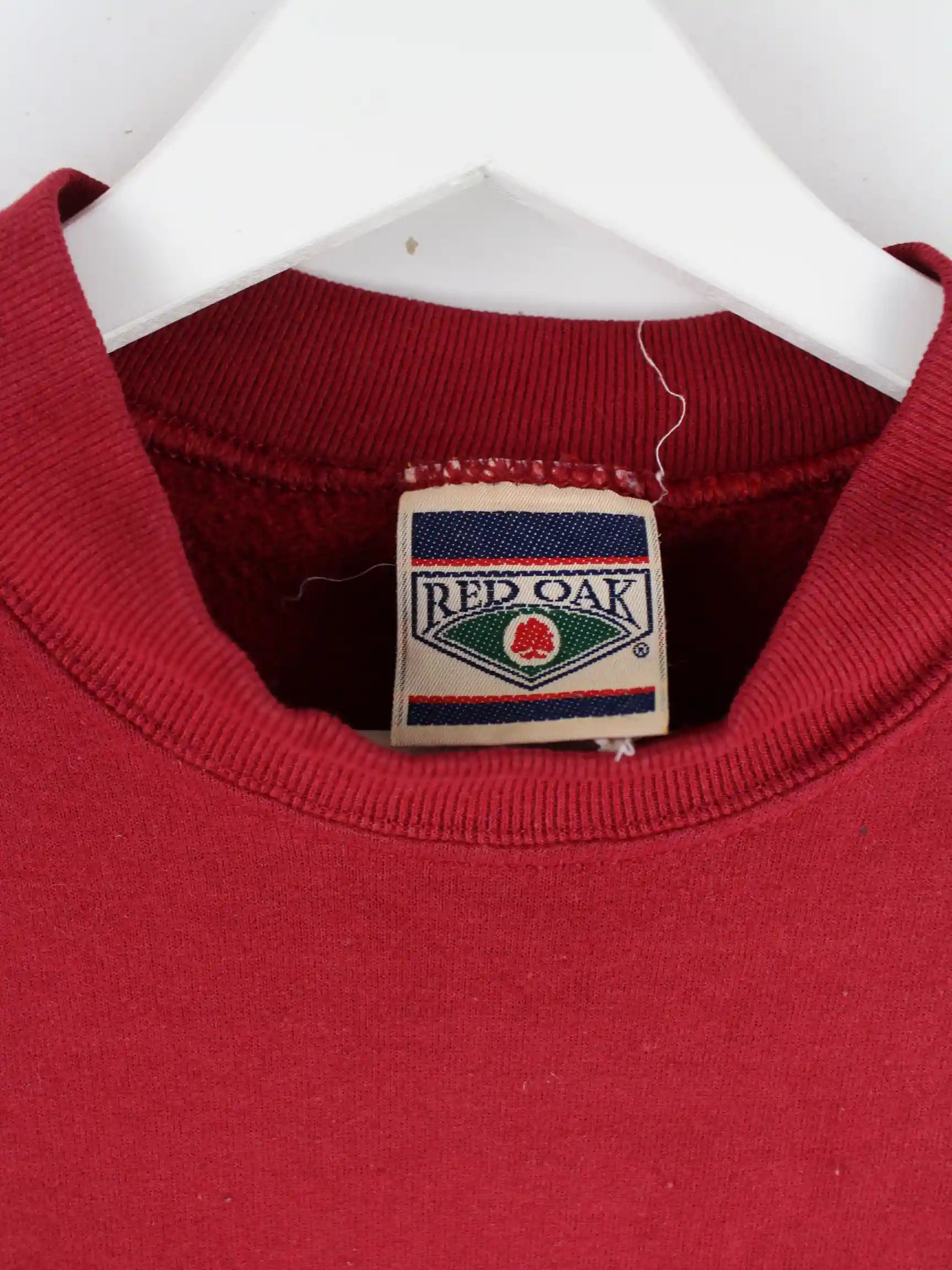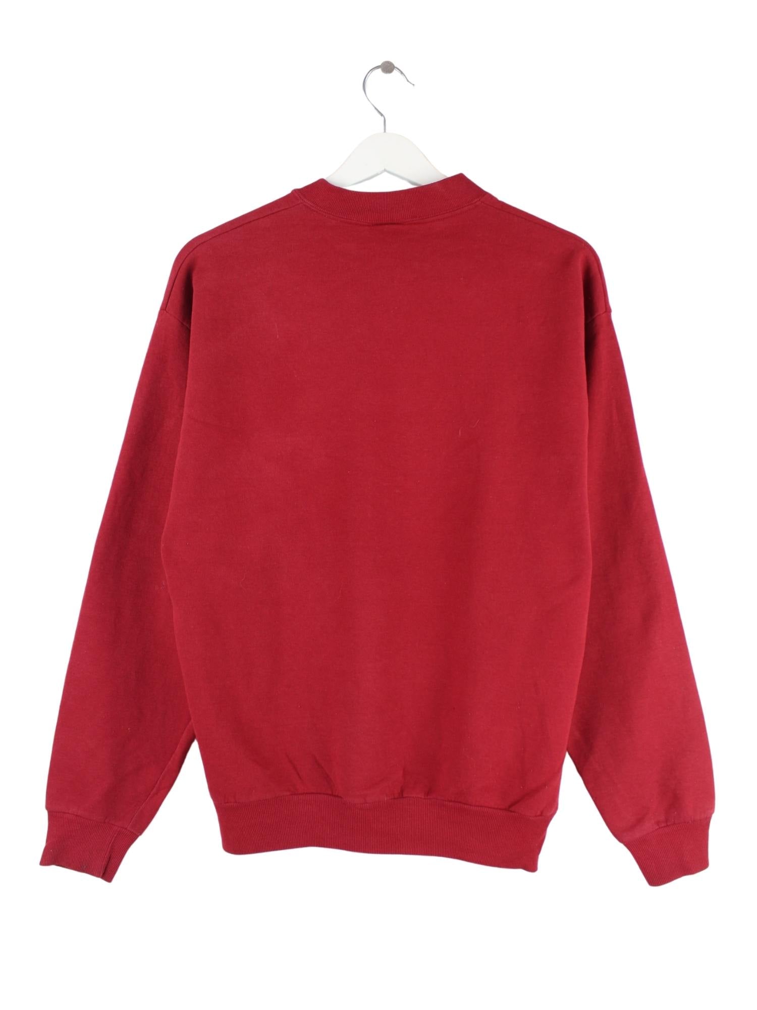 Roter Vintage Sweater mit gesticktem Logo aus den 90'ern in Größe M. Er ist aus einer Baumwollmischung produziert. Den Zustand würden wir als 'In Ordnung' bezeichnen (vergl. Bilder).