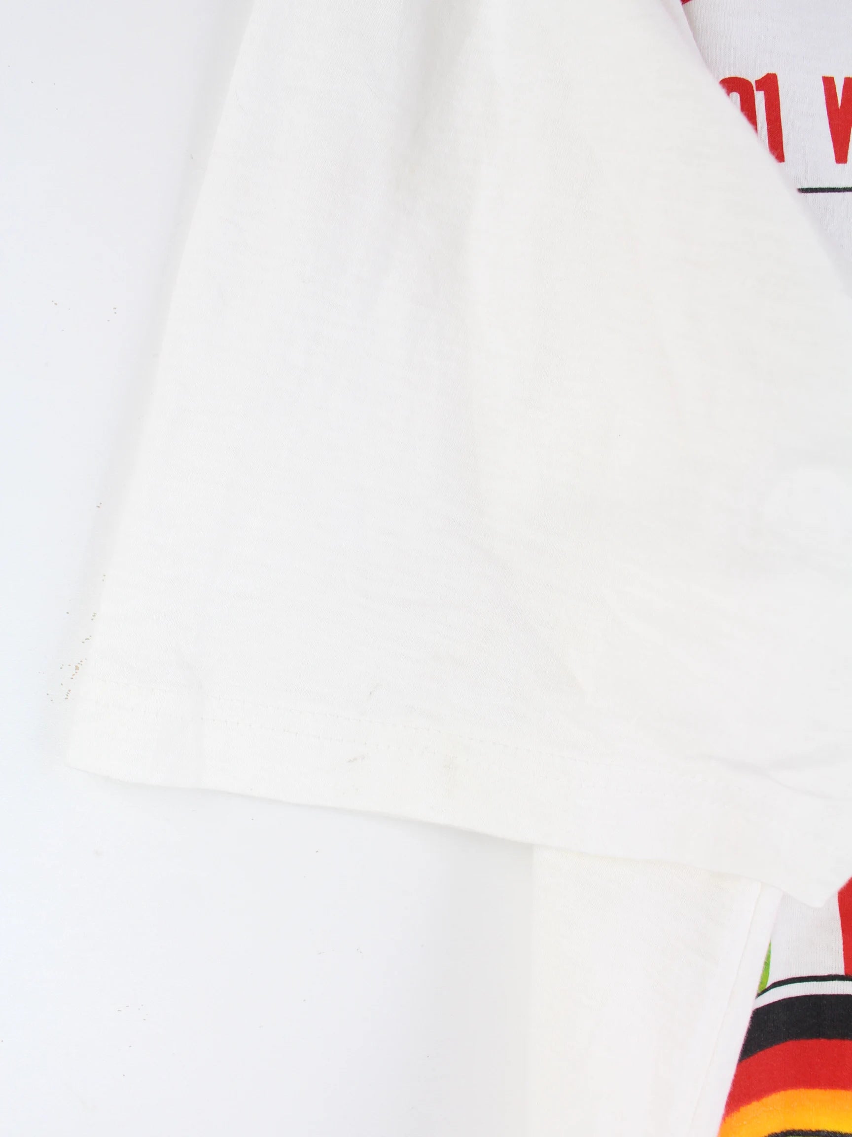 Weißes Vintage T-Shirt aus den 90'ern in Größe L. Es ist aus Baumwolle produziert. Den Zustand würden wir als 'In Ordnung' bezeichnen (vergl. Bilder).Mit schickem Racing Print.