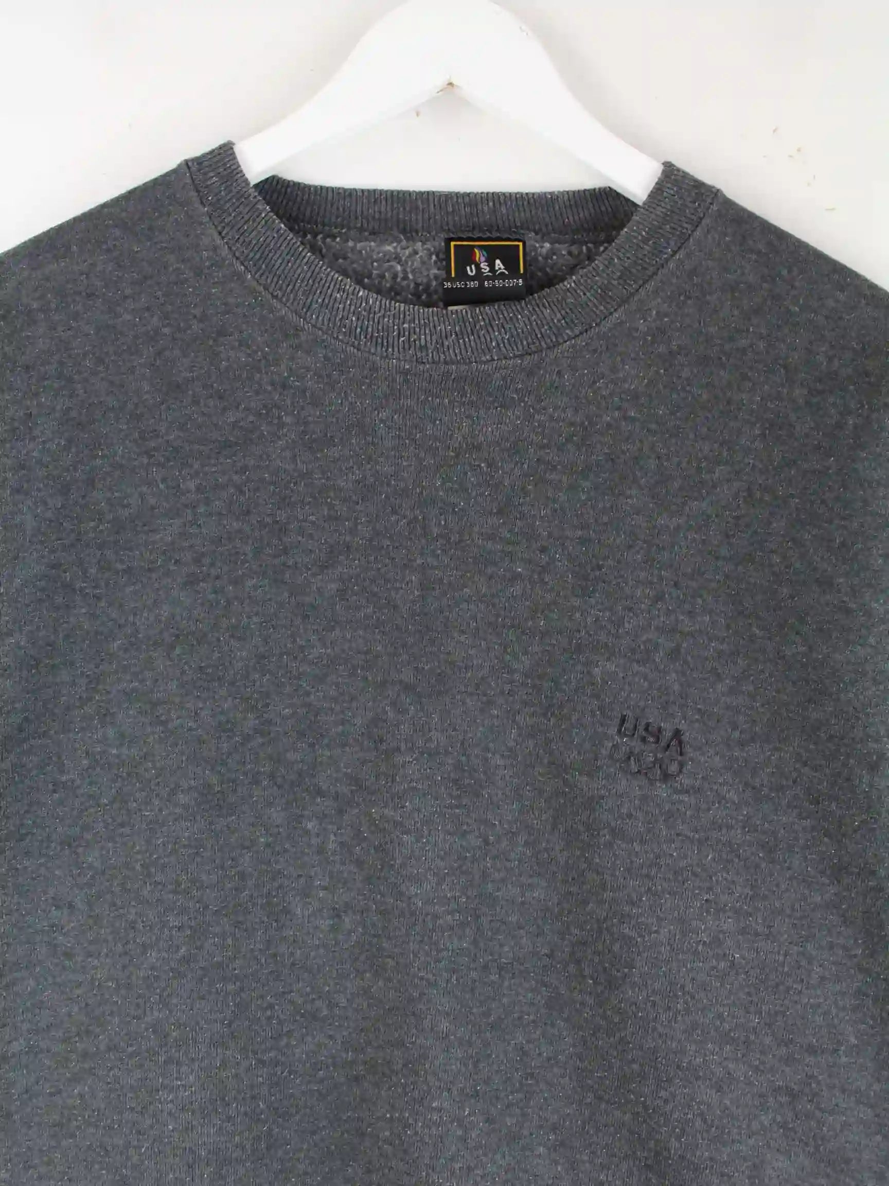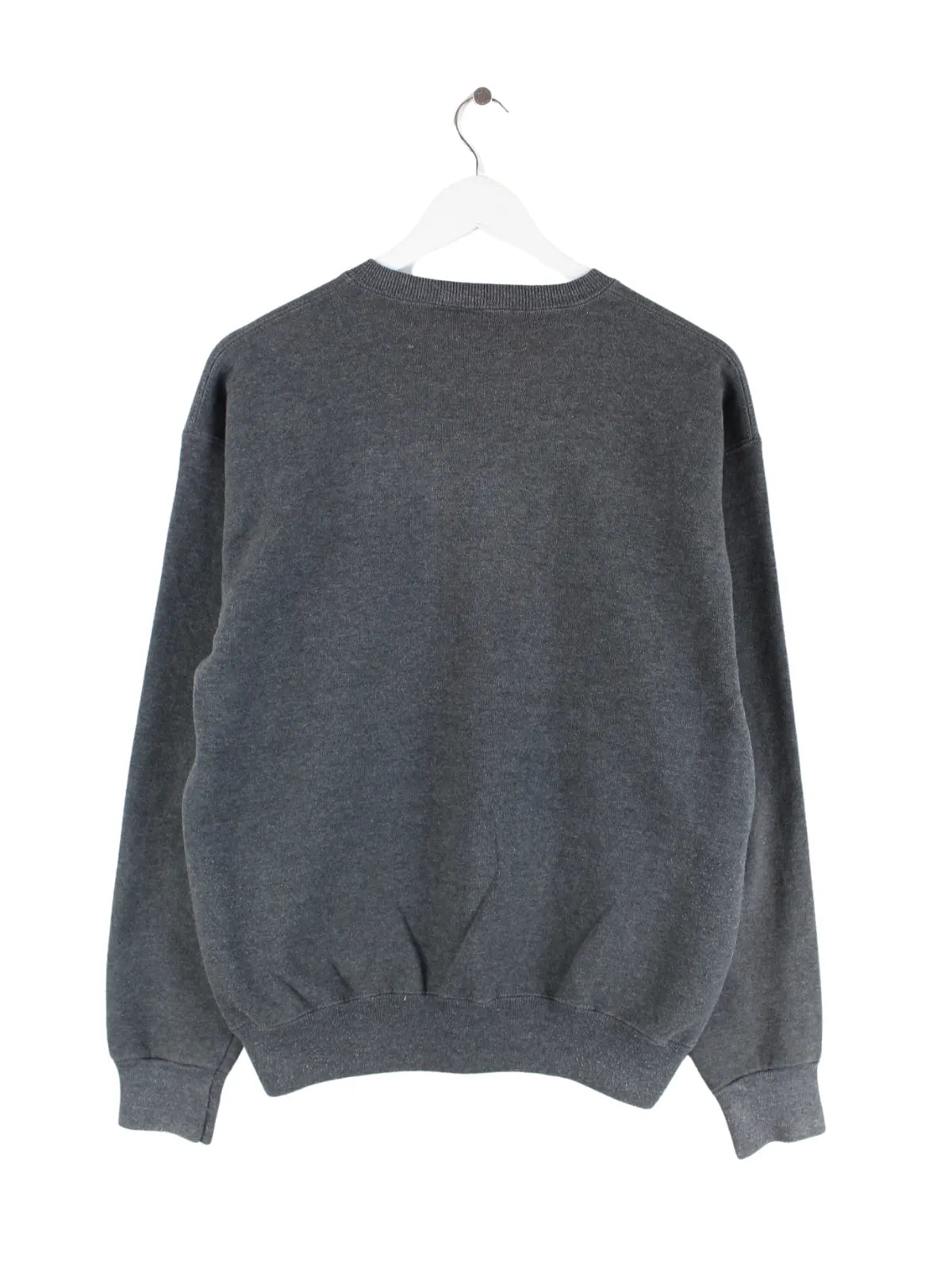 Grauer Vintage Sweater aus den 90'ern in Größe M. Er ist aus einer Baumwollmischung gefertigt und in sehr gutem Zustand im Bestand.